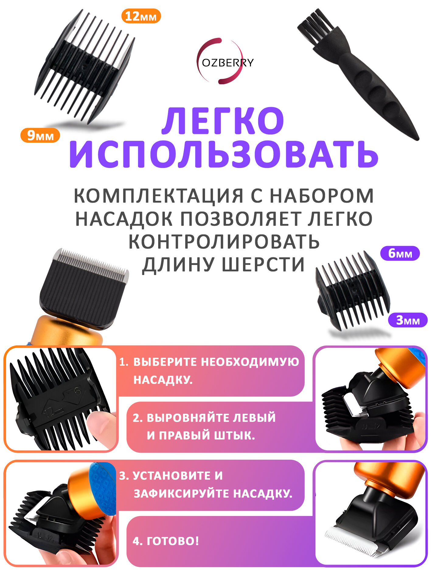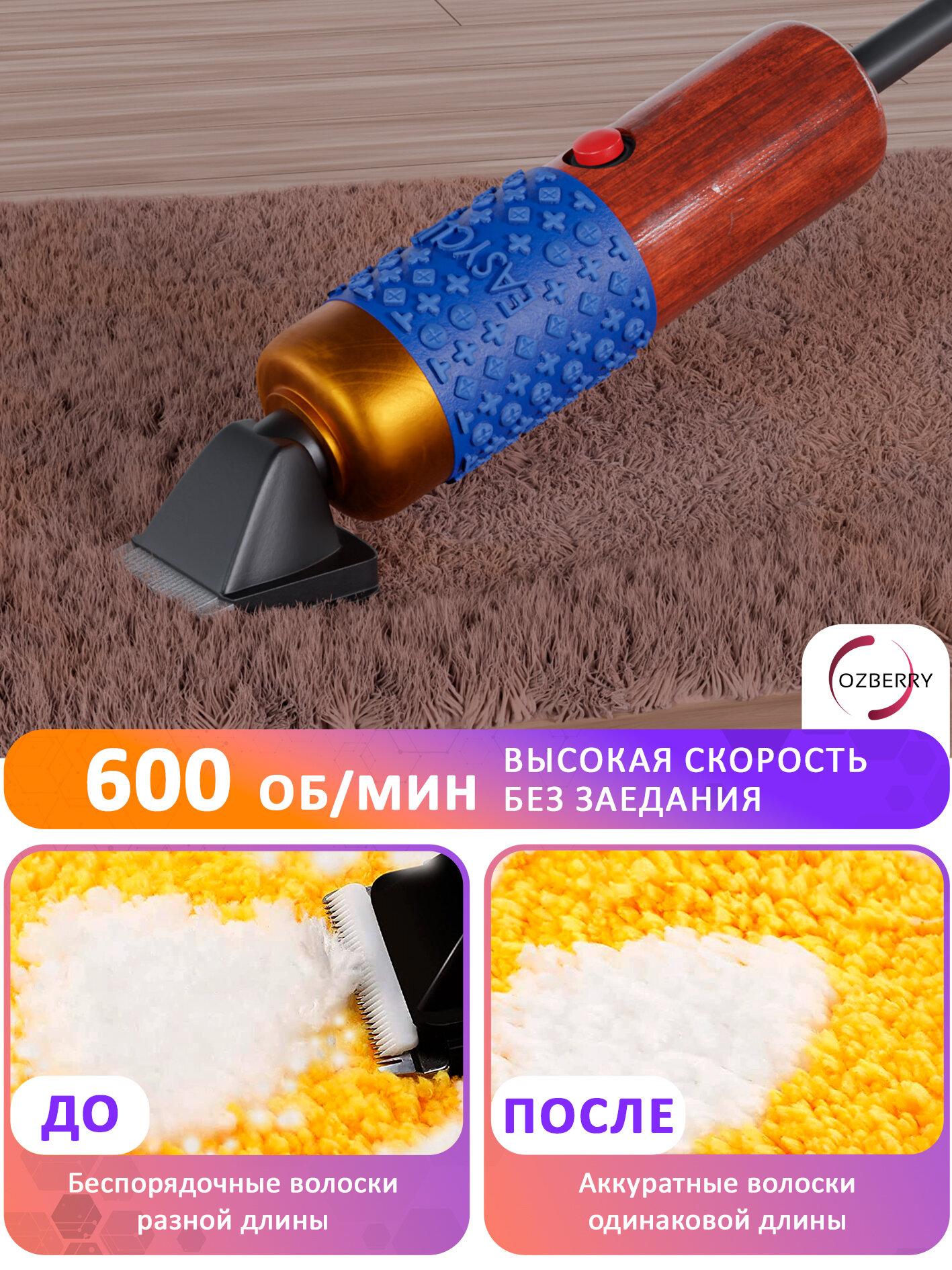 Триммер для животных OZBERRY — это надёжный инструмент по уходу за питомцами и коврами, сочетающий в себе мощность, безопасность и удобство.