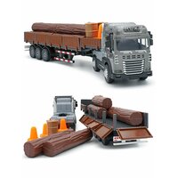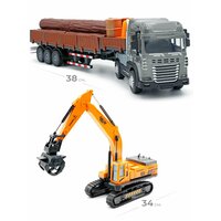 Грузовик с тематическим прицепом, для перевозки леса, так же в комплекте идёт кран лесопогрузчик. Фура со световыми, звуковыми эффектами, прицеп снимается. Кран лесопогрузчик с подвижной кабиной, стрела раскладывается, оснащен резиновыми гусеницами. Очень реалистичный набор для игры, подойдёт как мальчику, так и девочке. Цвет кабины может отличаться от главного фото, синий либо серый. Грузовик с тематическим прицепом Лесовоз с аксессуарами. Фура - тягач с прицепом, который можно отстегнуть имеет хорошую детализацию, она обладает звуковыми и световыми эффектами. светятся фары и слышен звук мотора. Кабина тягача выполнена из металла. Для сцепки и расцепления на тягаче предусмотрен рычажок. Машинка поставляется в транспортировочной (не подарочной) коробке. Цвет кабины может отличаться от главного фото, синий либо серый. • Для активации звуковых и световых эффектов нужно снять изоляционный стикер на дне машинки. Нажав на кабину, сверху активируется звук и свет. • Для того что бы снять и поставить прицеп на машинку используйте справа машинки рычаг, который закрывает и открывает сцепку. • Товар поставляется в транспортной коробке без заводской упаковки.