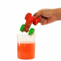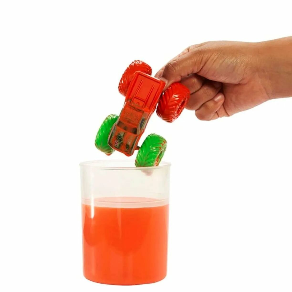 Наполните цилиндр водой и повращайте в нем машинку, пока вода не изменит цвет, затем вытащите её, чтобы увидеть декор своего монстр-трака.