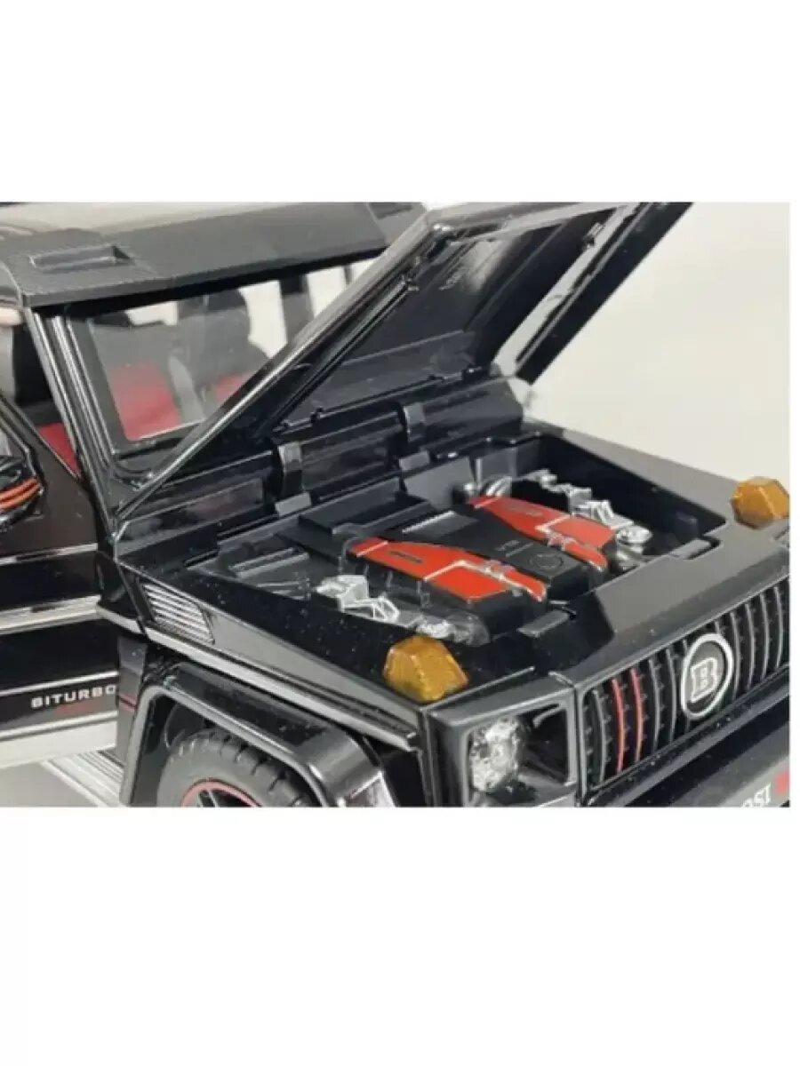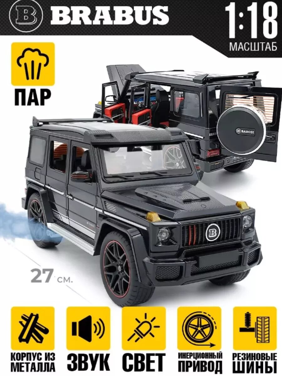 Коллекционная машинка Mersedes Brabus с дымом - это красочная металлическая модель внедорожника, которая станет отличным подарком для мальчиков и любителей коллекционных машинок. Mercedes Gelendwagen Brabus 800 имеет инерционный механизм, что позволяет машинке передвигаться по прямой и поворачивать без использования батареек. Кроме того, игрушечная машина оснащена звуковыми и световыми эффектами, которые добавят реалистичности в игру вашего ребенка. Детализация выполнена на высшем уровне, отличительной чертой является цифровая приборная панель, все продумано до мелочей, открывается даже лючок бензобака. Одной из интересных особенностей этой игрушки, является функция подачи пара с выхлопной трубы (имитация дыма), достаточно добавить воды в резервуар специальной пипеткой, которая идёт в подарок, резервуар находится в багажнике. После нужно перевести рычажок питания в режим ON, и нажать на переднюю ось автомобиля, он заведется, из выхлопной трубы пойдёт пар, и активируются световые и звуковые эффекты. В целом, игрушечная машина Mercedes Gelendwagen - отличный выбор для детей, которые любят играть с машинками и увлекаются автомобилями.