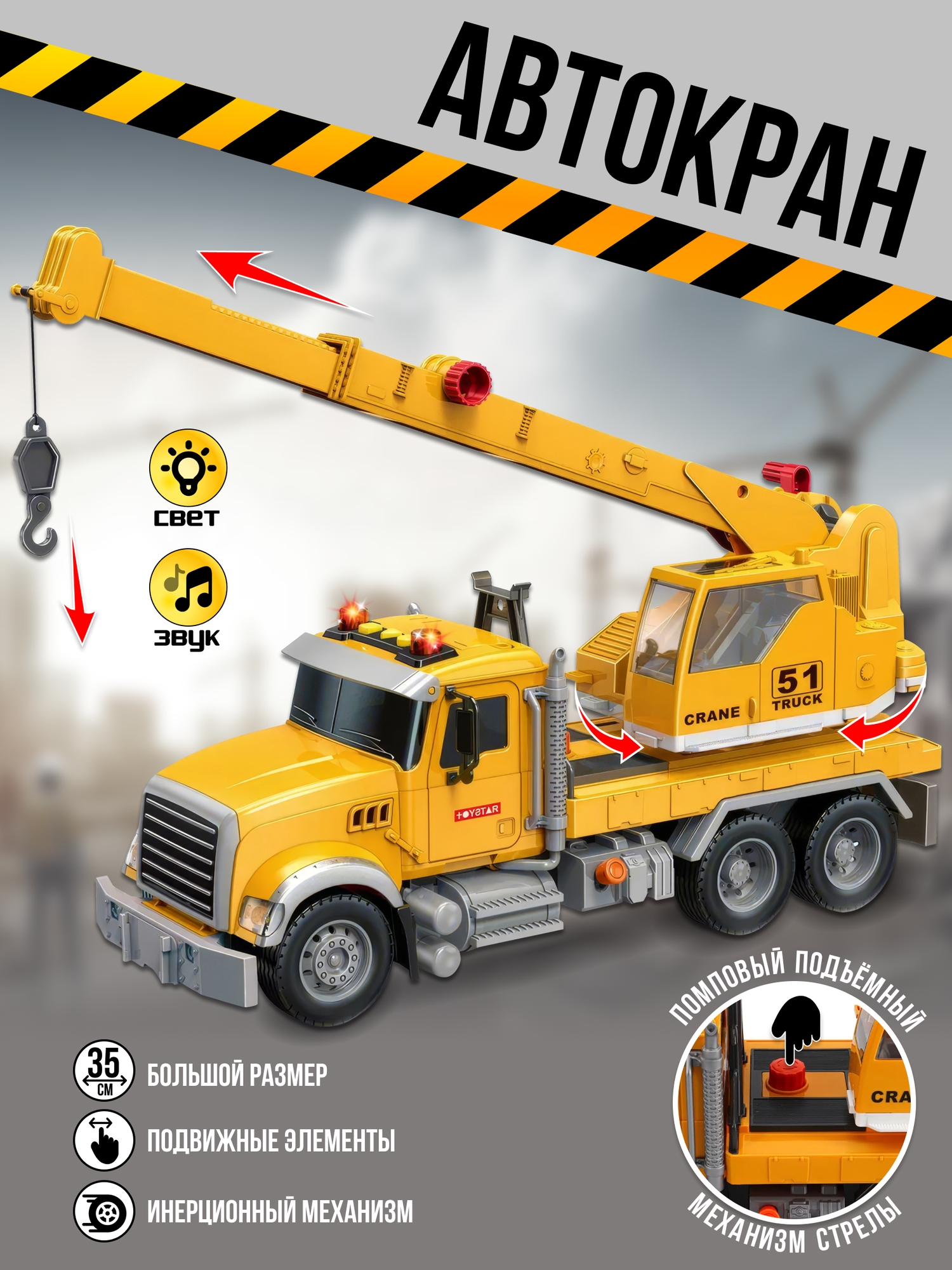 Машинка игрушечная спецтехника инерционный подъемный автокран длина 34,5 см, со светом и звуком