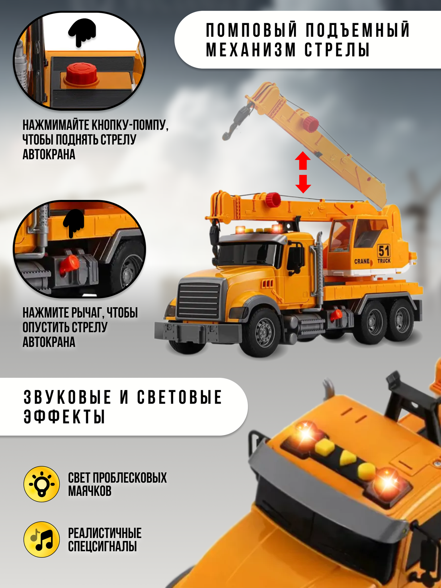 Машинка игрушечная спецтехника инерционный подъемный автокран длина 34,5 см, со светом и звуком: сравнение цен, характеристики, фото, актуальное наличие и цены.