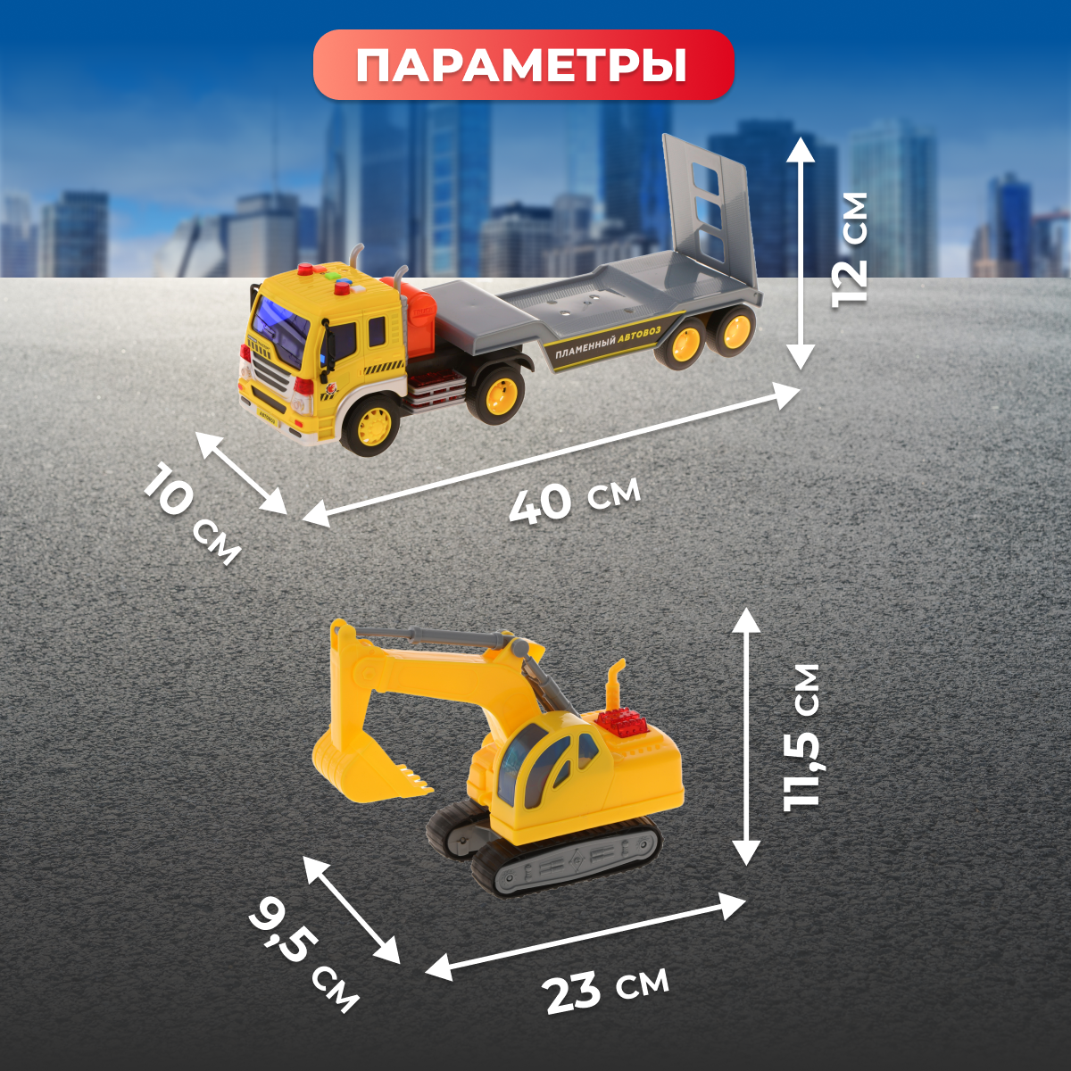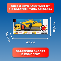 Игровой набор от ТМ «Пламенный мотор» включает 2 машины, которые станут одними из любимых игрушек в автопарке у ребенка. В комплекте – машина-автовоз и гусеничный экскаватор. Юный автолюбитель оценит по достоинству реалистичность данных моделей, их высокую детализацию и расширенный функционал. При нажатии на разноцветные кнопочки, расположенные на крыше автовоза, можно услышать реалистичные автомобильные звуки. Воспроизведение звуков сопровождается мерцающей подсветкой проблесковых маячков. У машины-автовоза предусмотрен фрикционный механизм движения – на разгон. Передние колеса ведущие. Грузовая платформа опускается. Рабочую платформу экскаватора можно поворачивать на 360 градусов. Ковш можно поднимать и опускать нажатием рычага в правой части корпуса игрушки. Свет и звук работают от 3-х батареек типа AG13/LR44 (входят в комплект в демонстрационных целях). Размер автовоза (ДхШхВ): 38,5х10х12 см. Размер экскаватора: 23х9,5х11,5 см. Изготовлено из полимерных материалов, с элементами из металла. Рекомендованный возраст: 3 года +
