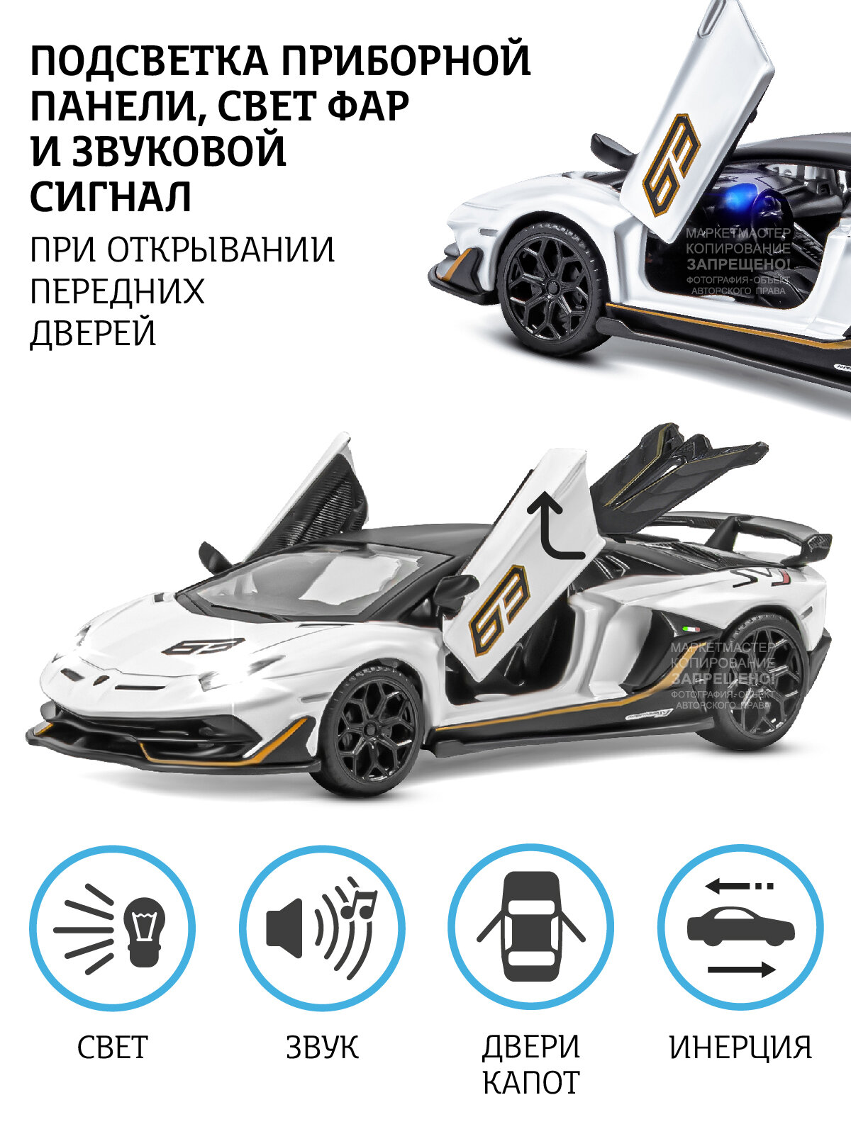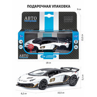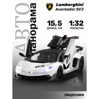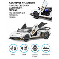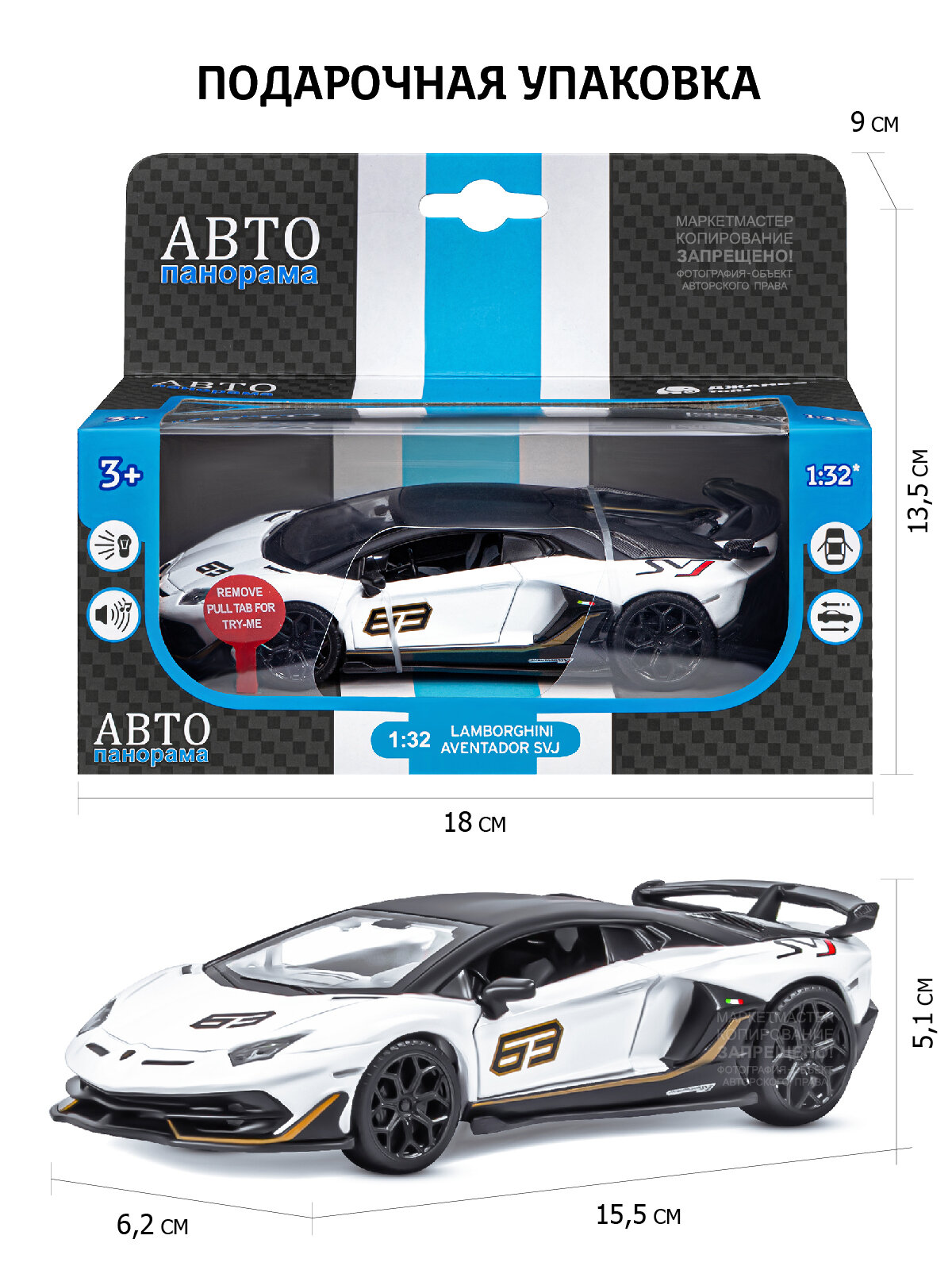 Металлическая лицензионная машинка Lamborghini SVJ - уменьшенная копия роскошного спортивного автомобиля в масштабе 1:32. Она отлично дополнит игрушечный автопарк и станет прекрасным подарком для маленького автолюбителя. Модель машинки детально проработана и выполнена с легко узнаваемым спортивным дизайном как у оригинала. У машинки открываются двери и капот. Если нажать на корпус или открыть двери, загорятся фары и включится звук, что сделает игру более реалистичной. Игрушка оснащена инерционным механизмом. Чтобы она поехала вперед, ее нужно немного откатить назад. Яркий спортивный дизайн, спойлер, обтекаемая форма кузова, спортивный обвес придают суперкару стремительный внешний вид - не машинка, а мечта! Колеса с резиновыми покрышками и литыми дисками, детально проработанный салон, моторный отсек, фары, прозрачные окна, выхлопные трубы - всё как у настоящего автомобиля. Благодаря своей реалистичности, модель подойдет для коллекционирования. Ребенок будет с удовольствием играть с такой машинкой дома и на улице, а благодаря компактным размерам, сможет брать ее в гости или в путешествие. Игрушка развивает мелкую моторику, реакцию и координацию движения, расширяет кругозор и знакомит с техникой. ТМ "Автопанорама" - собери всю коллекцию! Характеристики: Возраст: от 3-х лет Масштаб: 1:32 Материал корпуса: металл Функции: инерционный механизм, открываются двери, капот, свет, звук Размер коробки: 17,5 х 12,5 х 6,5 см Размер машинки: 14,5 х 6,5 х 3,1 см