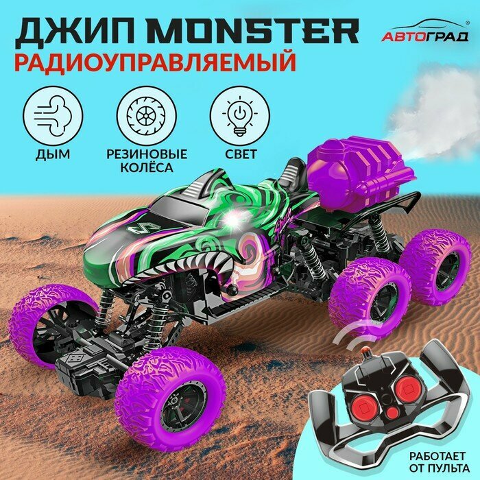 Купить Машинка на пульте управления MONSTER, 1:16, эффект дыма, световые эффекты, работает от аккумулятора, цвет зелёный с доставкой по всей России.