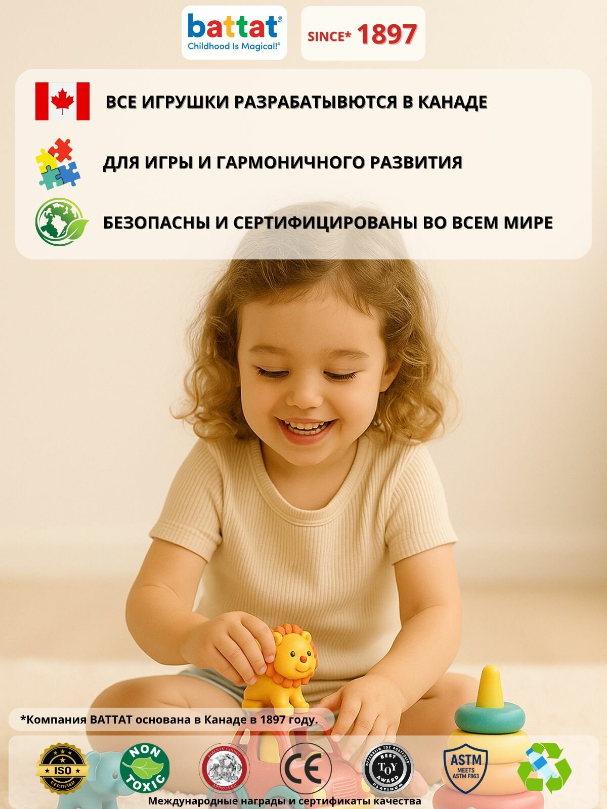 Battat - это полный набор развивающих игрушек для детей от 0 лет. В качестве основного материала используется нетоксичный, ударопрочный и яркий ABC(АБС) пластик.