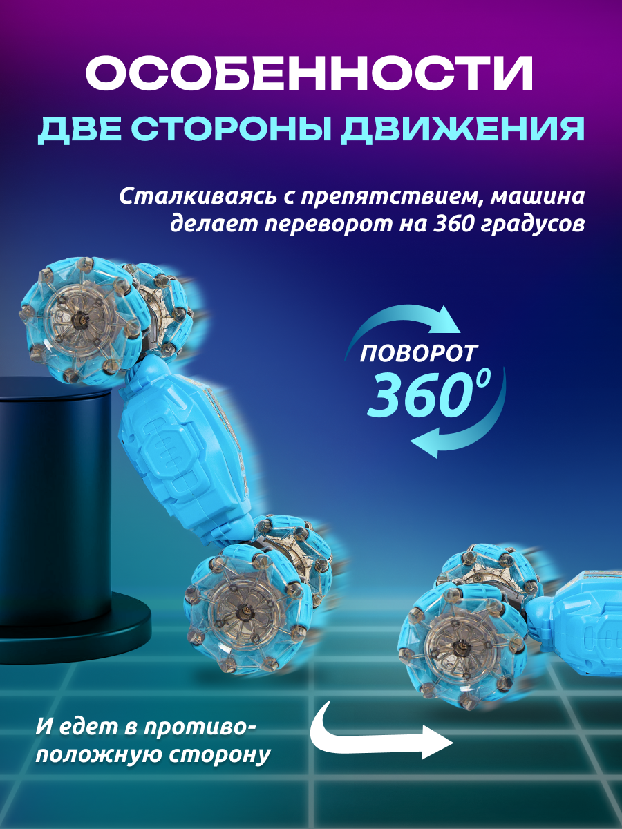 Умные колеса и дрифт: Машинка способна на дрифт — движение боком и по диагонали, что делает управление еще более захватывающим.