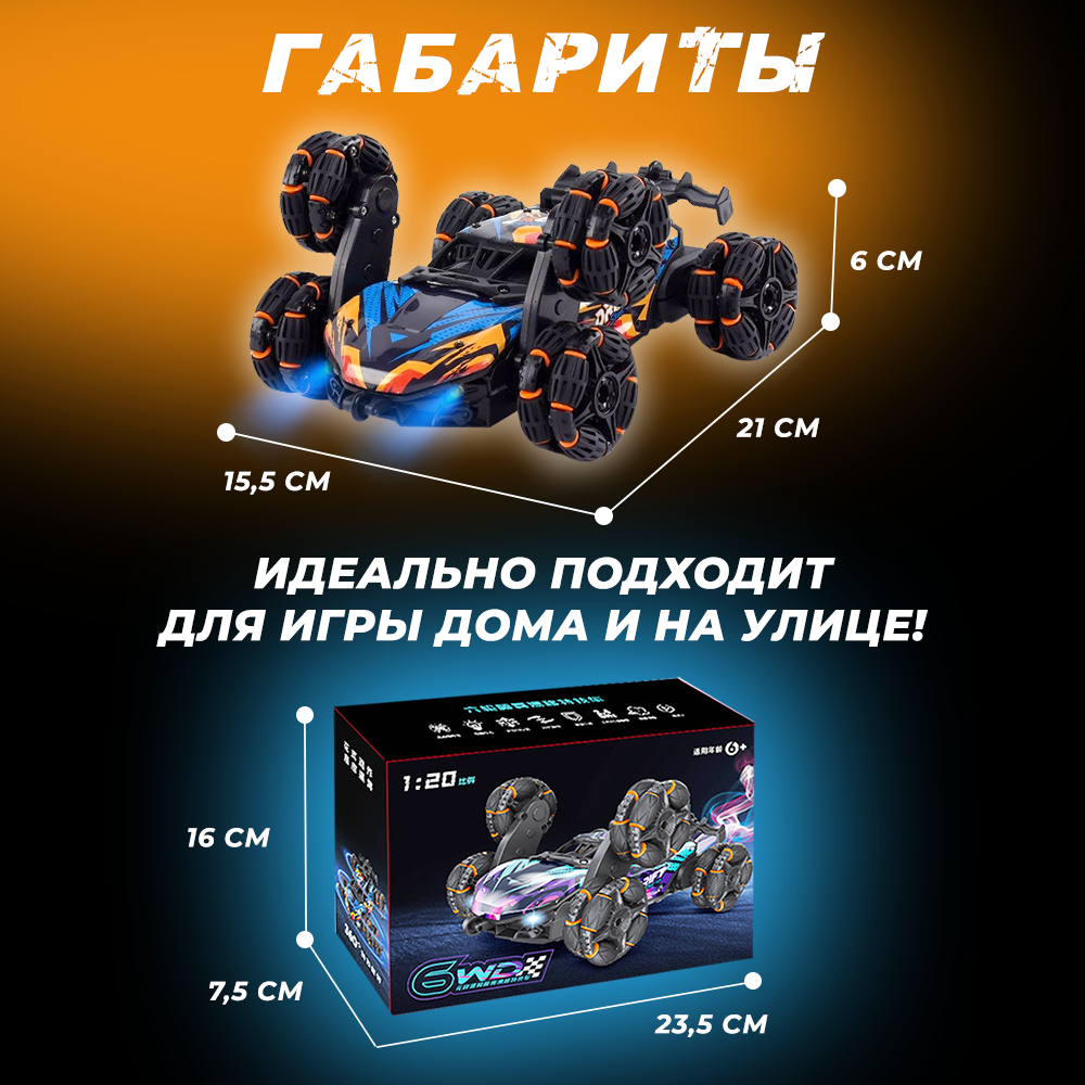 Перед первым использованием обязательно полностью зарядите аккумуляторную батарею и прочтите руководство по эксплуатации! Приятной игры! Быстрая машинка на радиоуправлении для дрифта машинка на пульте управления внедорожник для дрифта с дымом, масштаб 1:20. Машинка управляется жестами и джойстиком, обладает повышенной проходимостью: ездит по бездорожью, гравию, траве и песку. Радиоуправляемая машинка развивает высокую скорость, позволяет управлять ею на расстоянии до пятидесяти метров, время работы до тридцати минут, два перезаряжаемых аккумулятора, а также обладает крепким корпусом из металла и пластика АВС. Машинка на радиоуправлении перевертыш с дымовыми эффектами позволит развить скорость реакции, мелкую моторику и заинтересованность в технике и принципах работы радиоуправления. Наша команда заботиться о том, чтобы товар дошел до Вас в полной комплектации, целости и сохранности, защищая заводскую коробку дополнительной. Перед использованием пожалуйста внимательно прочтите инструкцию по эксплуатации и полностью зарядите аккумуляторную батарею перед тем, как установить ее в машинку, так Вы получите максимум удовольствия от скорости и маневренности машинки.