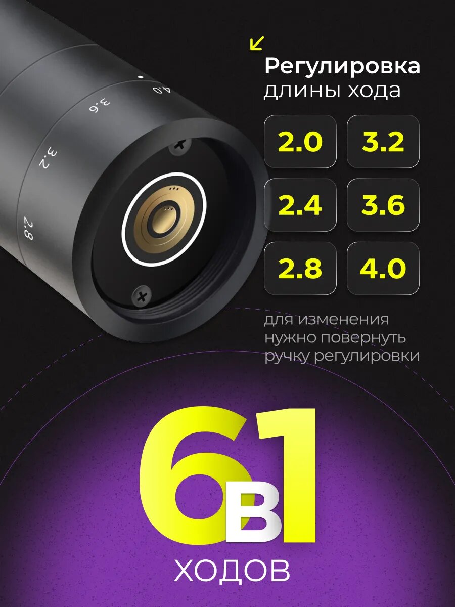 -Регулируемый ход 2,0-4,0 мм -Используется система Direct Drive и специально разработанный 8 ватный мотор Ambition --Custom Motors -Ход: 2,0 мм- 2,4 мм - 2,8 мм - 3,2 мм - 3,6 мм- 4,0 мм (6 вариантов длины хода) -Вес 216 гр -Емкость аккумулятора 1900mAh. -Время работы 2-6 часов -Время зарядки 2 часа