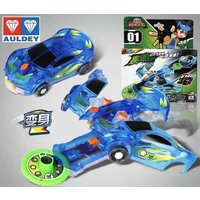 машинка разгоняется, ловит специальный диск, делает кувырок и самостоятельно трансформируется прямо в воздухе. Обратно в машинку игрушка собирается вручную.