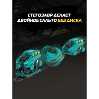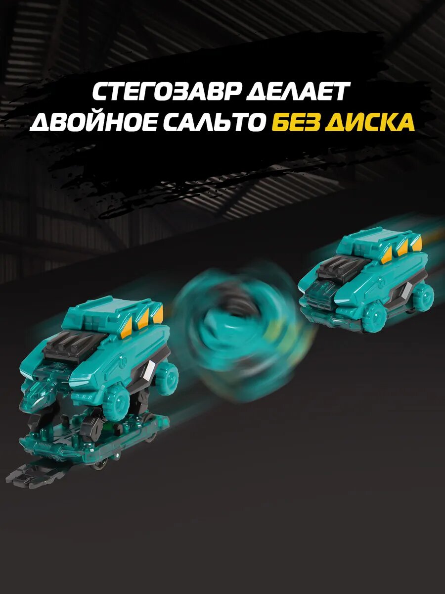 синхронная трансформация: одна из машинок захватывает два диска, катапультирует вторую машинку, и они одновременно трансформируются в воздухе; обратно в машинку игрушка собирается вручную; в комплекте с турбо-скричером взаимозаменяемы с машинками из 4-ой линейки