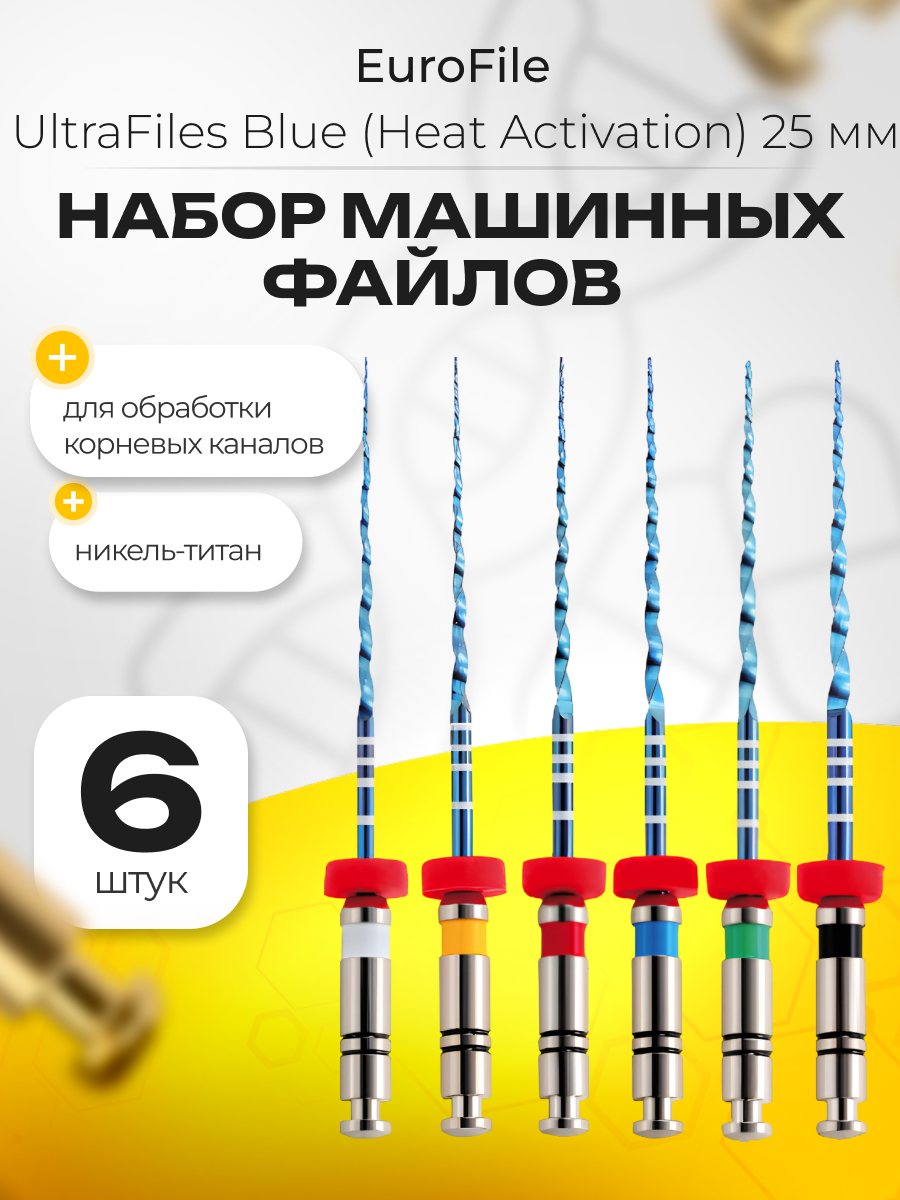 Машинные файлы UltraFiles Blue (Heat Activation) 25мм, в наборе: 04 15-40 (04/15, 04/20, 04/25, 04/30, 04/35, 04/40), никель-титан, 6 шт, Eurofile: сравнение цен, характеристики, фото, актуальное наличие и цены.