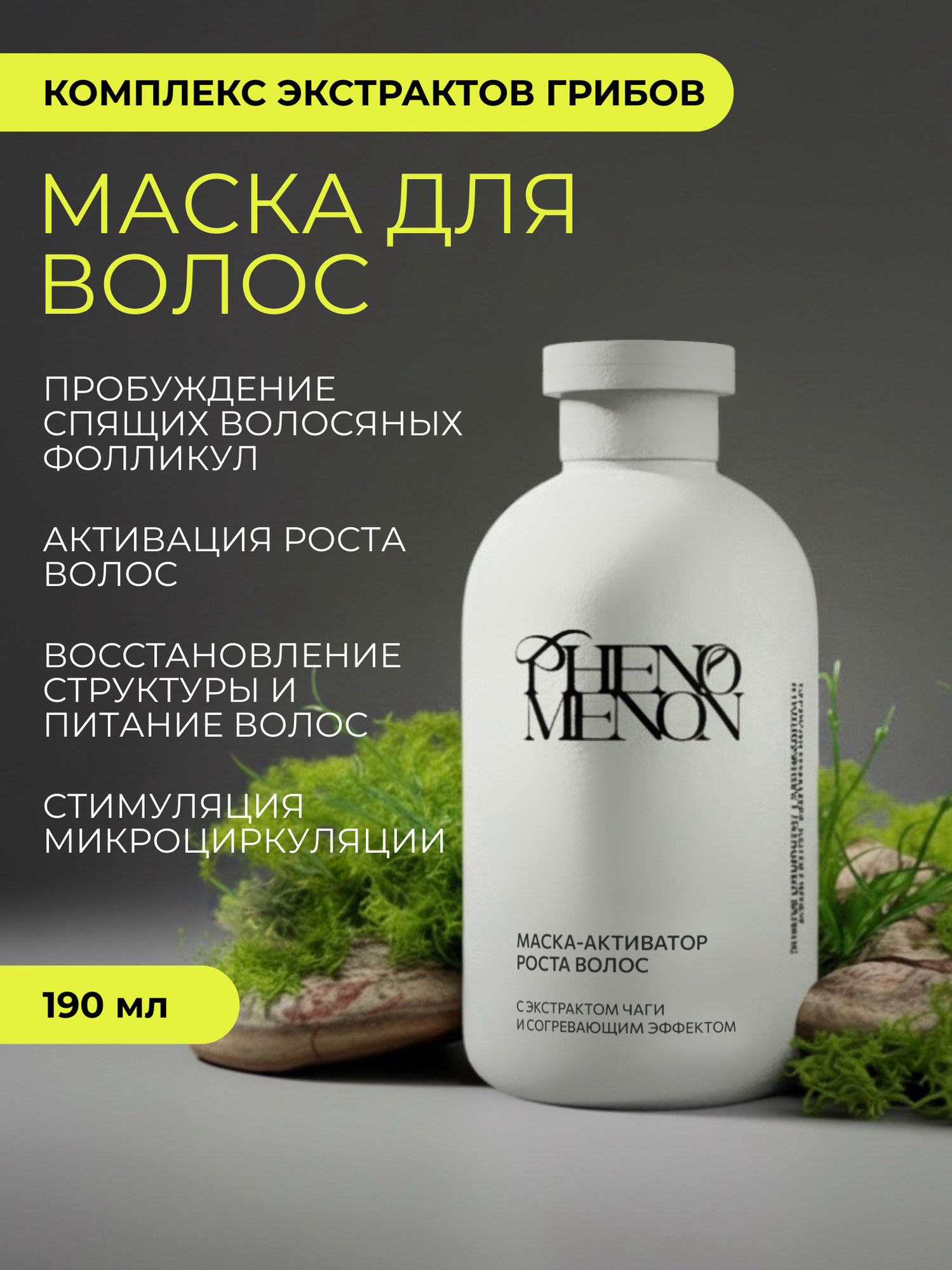 Маска-активатор роста волос Phenomenon с экстрактом чаги – средство профессионального ухода за кожей головы и волосами. За счет экстракта чаги и других активных компонентов в составе маска моментально стимулирует микроциркуляцию кожи головы, пробуждает спящие волосяные фолликулы, а также увлажняет и укрепляет волосы по всей длине, пробуждая их естественную красоту и сияние. Маска обладает насыщенным ароматом с оттенками бергамота, жасмина, мускуса, ванили и древесными нотами. Питательная текстура маски комфортно наносится не только на длину волос, но и на кожу головы. Регулярное применение маски позволяет сократить выпадение волос, стимулирует их рост, способствует восстановлению, а также нейтрализует повреждения, вызванные физическим и химическим воздействием.
