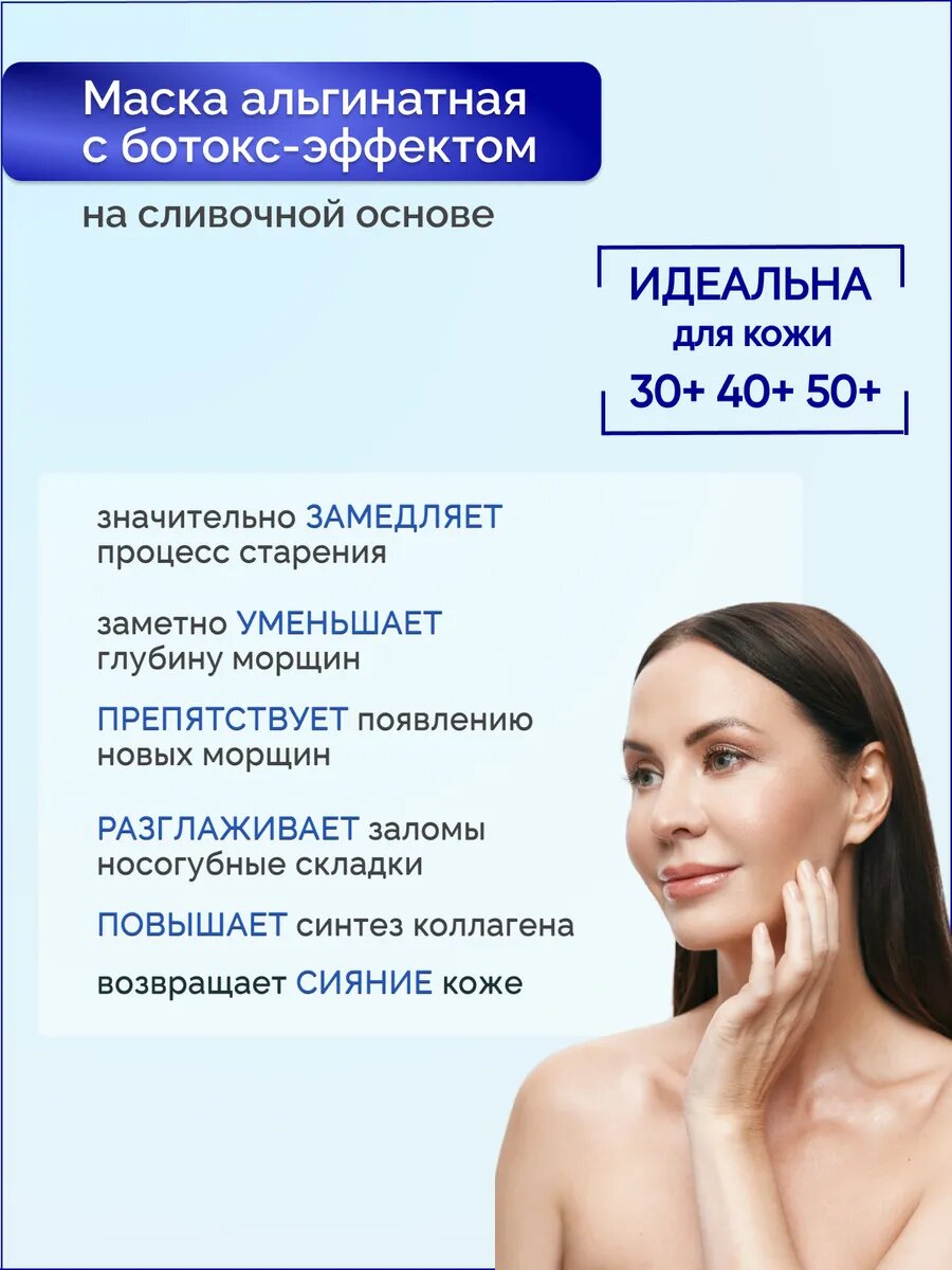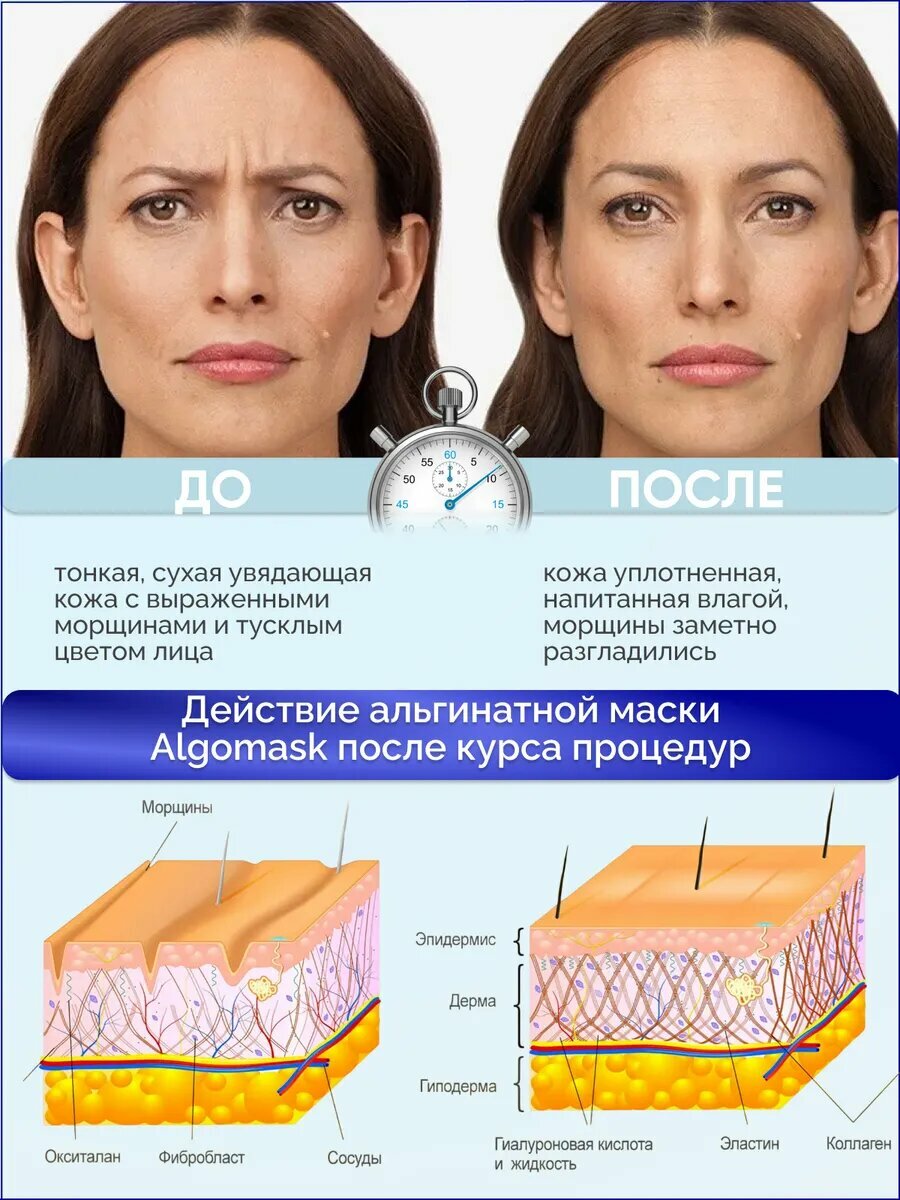 | Дополнительная информация | Через 6–7 мин маска образует плотную эластичную пленку. Маску рекомендуется снимать через 20–25 мин одним пластом («чулком») снизу вверх, предварительно слегка отсоединив ее по краям от кожи. Остатки маски снимают влажной салфеткой. |