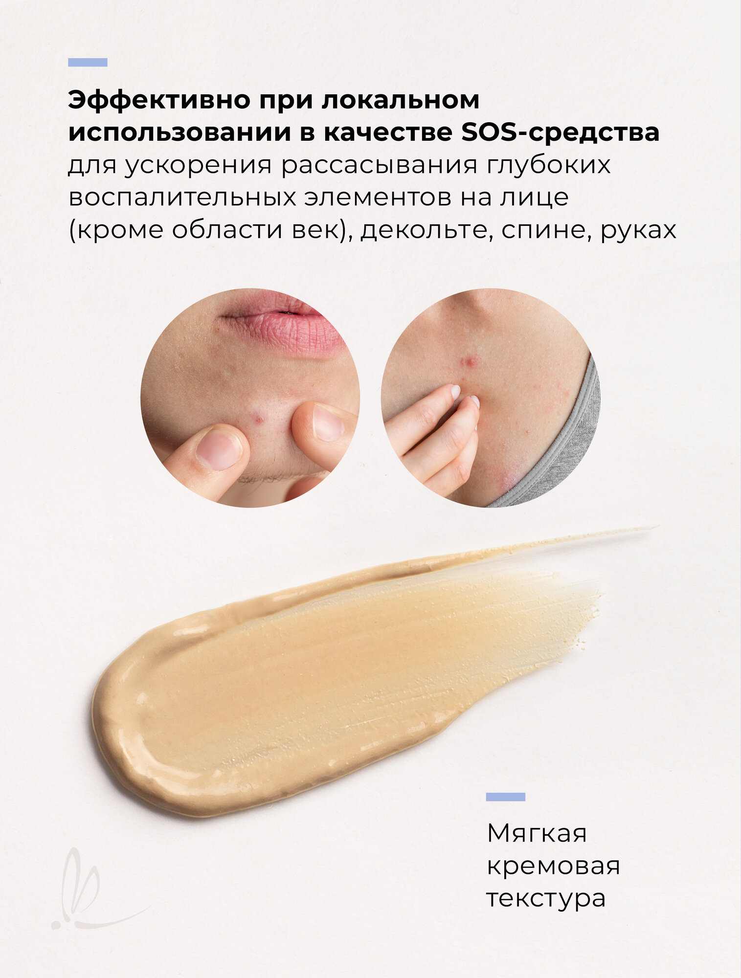 | Способ применения | 1. Нанести маску на предварительно очищенную кожу на 20-30 минут, смыть теплой водой. Применять 2-4 раза в неделю. 2. В качестве SOS средства, для ускорения созревания глубоких воспалительных элементов, нанести маску локально плотным слоем на проблемные зоны и оставить до 8 часов. Смыть теплой водой. При необходимости закрыть ватным диском и закрепить пластырем. Процедуру можно повторить. |