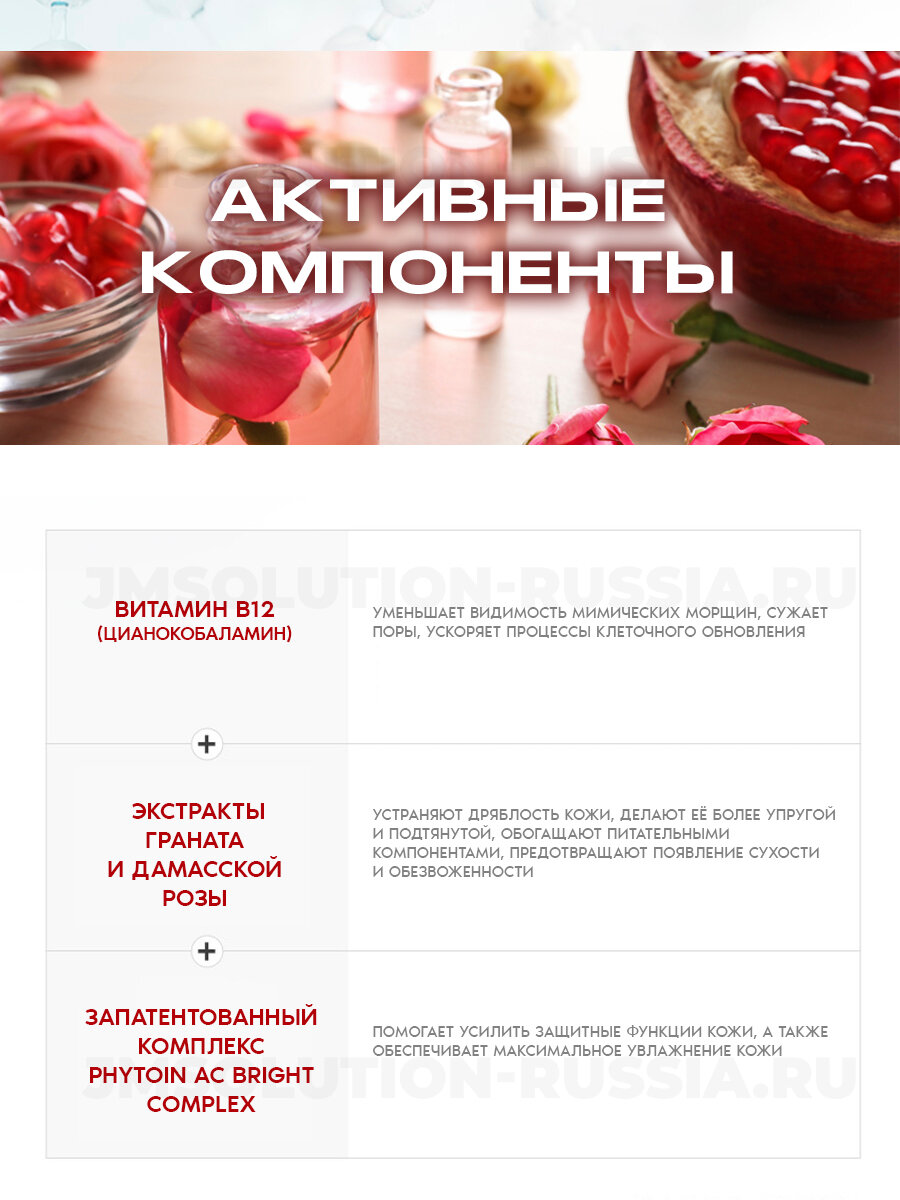 | Активный ингредиент | AHA-кислоты, D-пантенол, PHA-кислоты, аденозин, аллантоин, аргинин, бетаин, витамин B3 (ниацинамид), витамин B5 (пантотеновая кислота), витамин C, гиалуроновая кислота, глицерин, жемчужная пудра, кальций, коллаген, пантенол (провитамин B5), пептиды, пробиотики, сквалан |