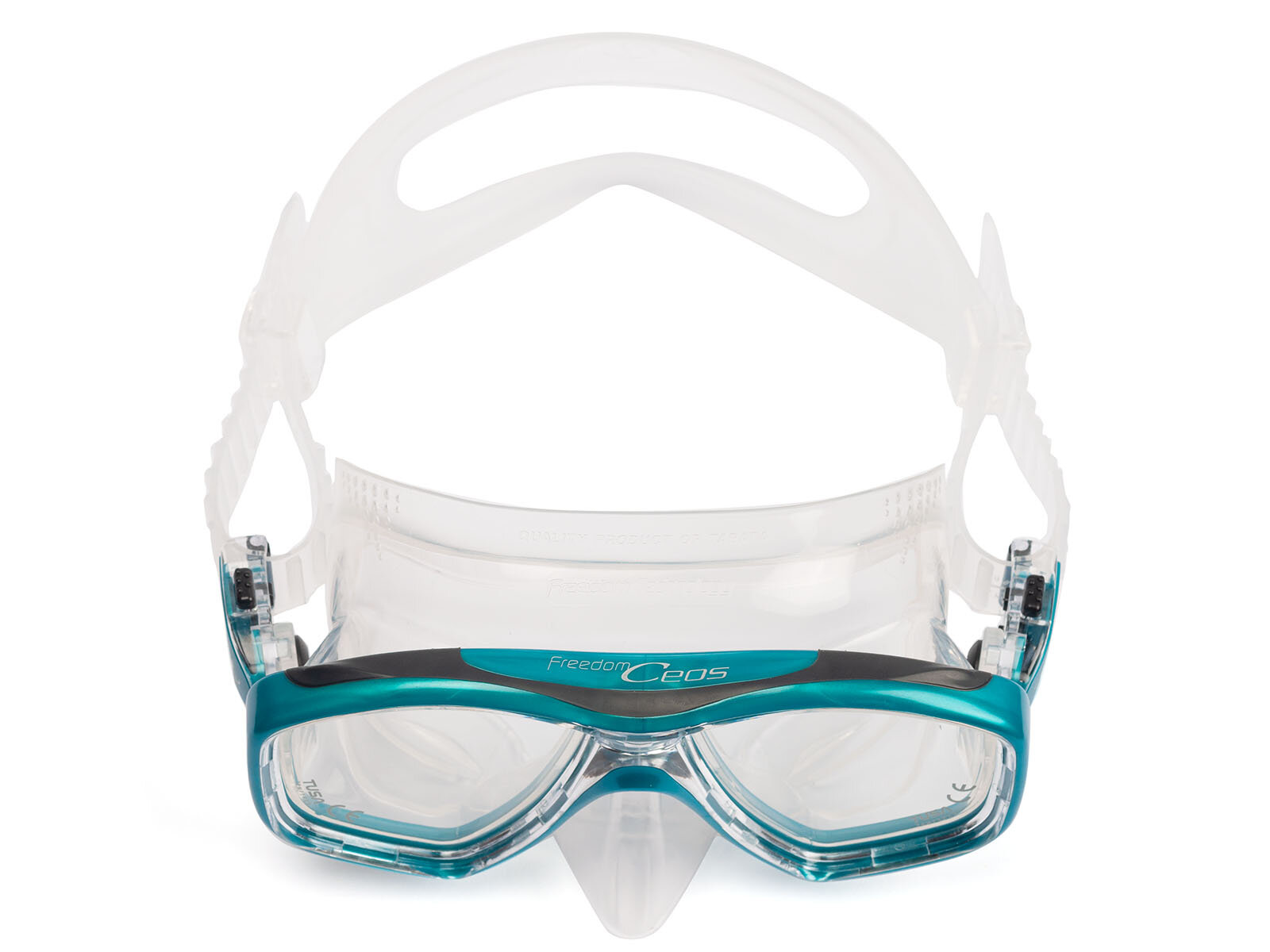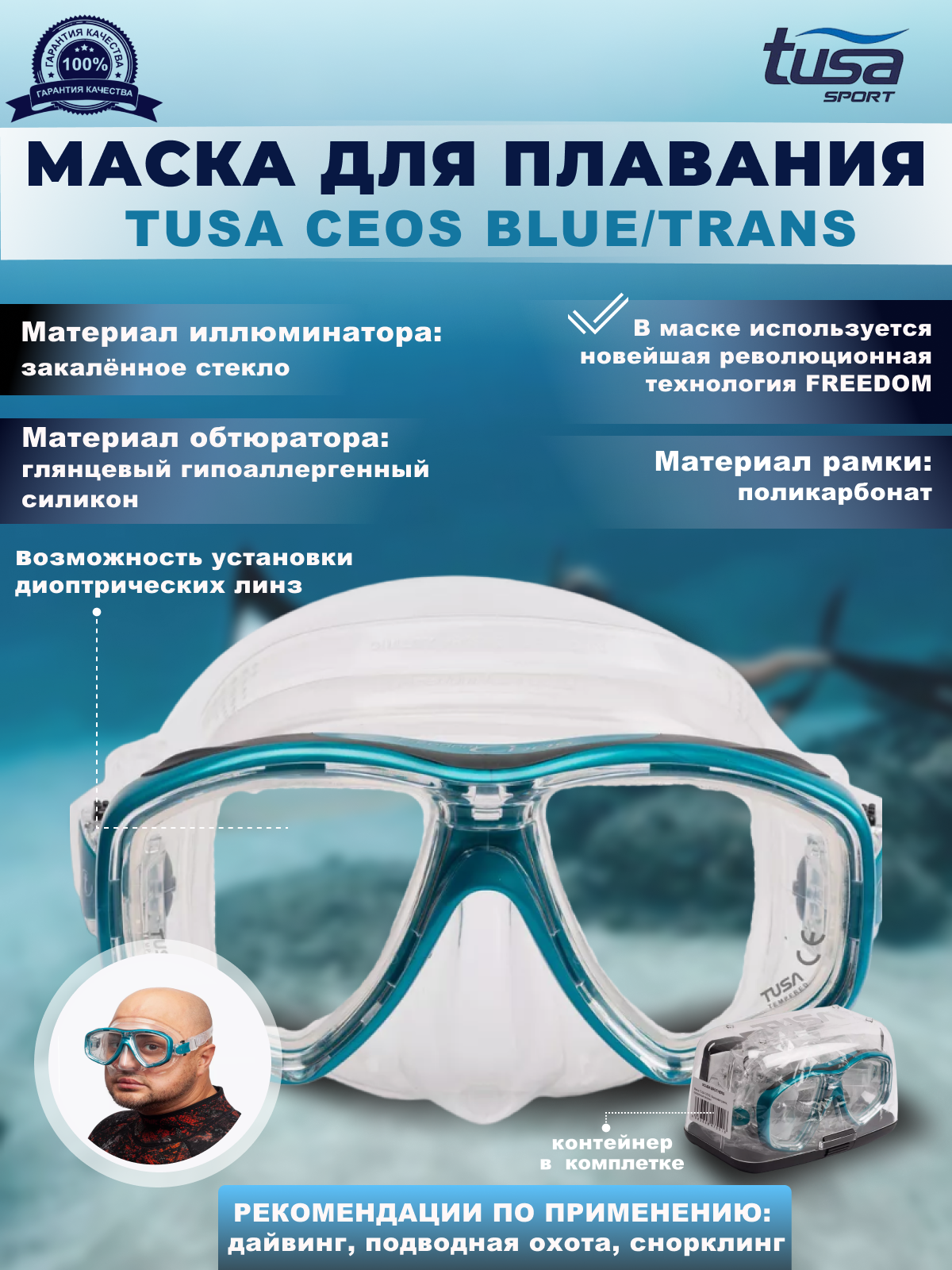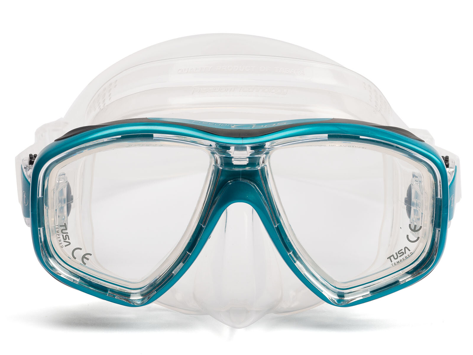 Маска TUSA CEOS, бирюзовая рамка, прозрачный силикон, это двухстекольная низкопрофильная маска с небольшим подмасочным объемом, с возможностью установки диоптрических линз. В маске используется новейшая революционная технология FREEDOM, обеспечивающая комфорт, отличную посадку на лице и превосходный обзор.