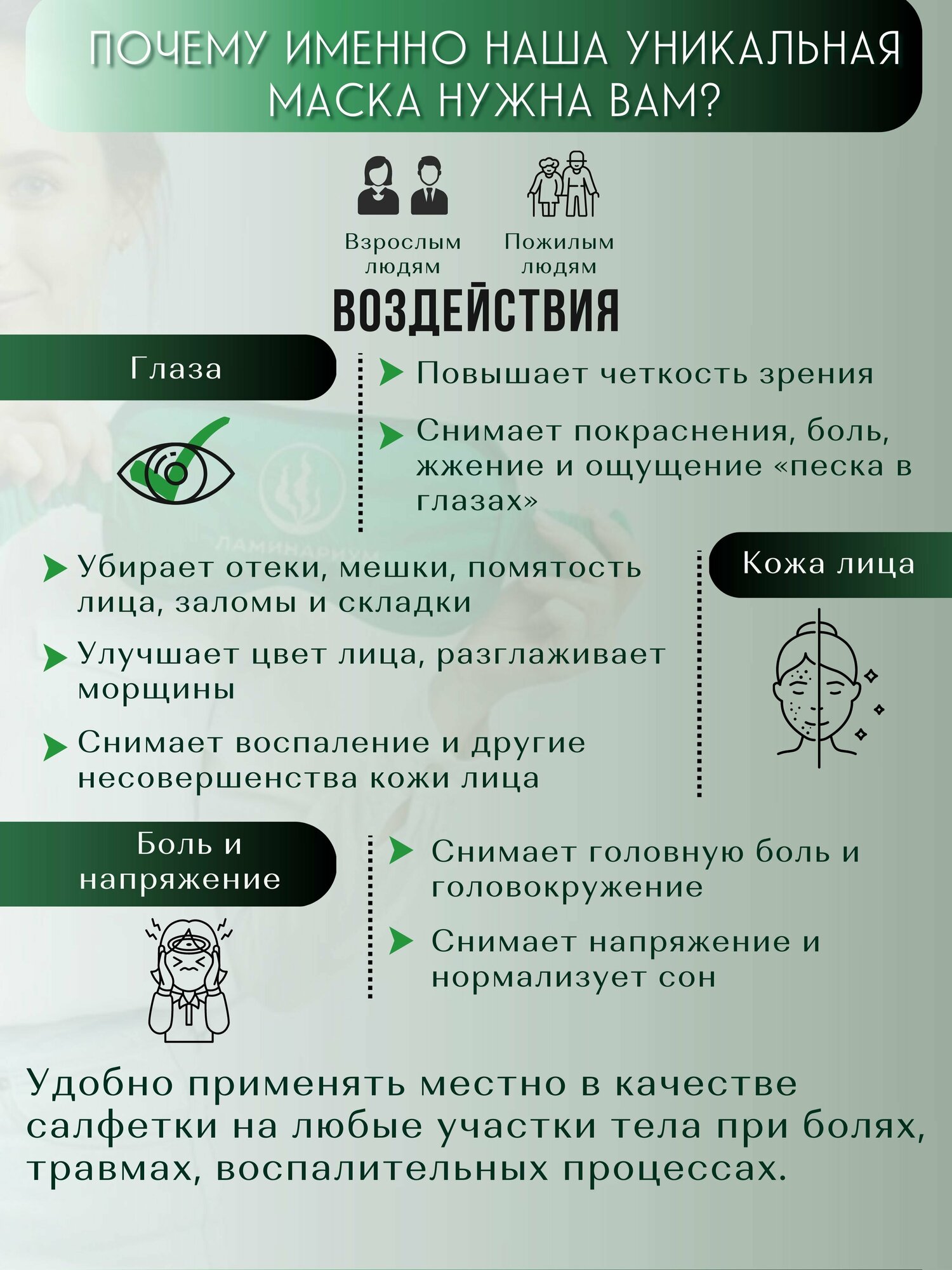 Маска для сна с микросферами ламинариум препятствует нарушению кровообращения в глазах, снимает дискомфорт, покраснения и боль, жжение и чувство «песка в глазах». Маска не только снимает напряжение и усталость, вызванные работой перед компьютером, но и значительно уменьшает вредное воздействие компьютеров на организм человека.