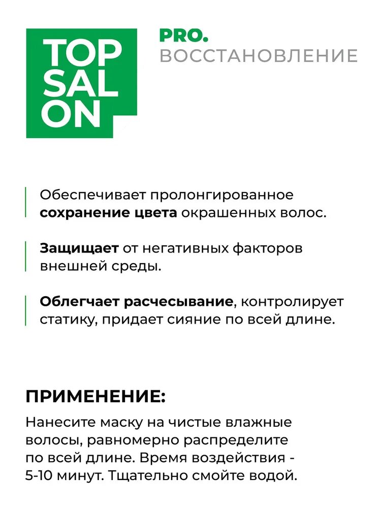 | Инструкция по применению | нанесите маску на влажные волосы, оставьте на 5-10 минут, смойте. Рекомендуется к применению 1-2 раза в неделю |