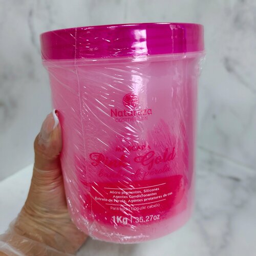 Маска Pink Gold от Natureza имеет кондиционирующие вещества, экстракт жемчуга и средства защиты цвета после окрашивания, глубоко питает, содержит в себе липиды - которые защищают волосы от внешних факторов