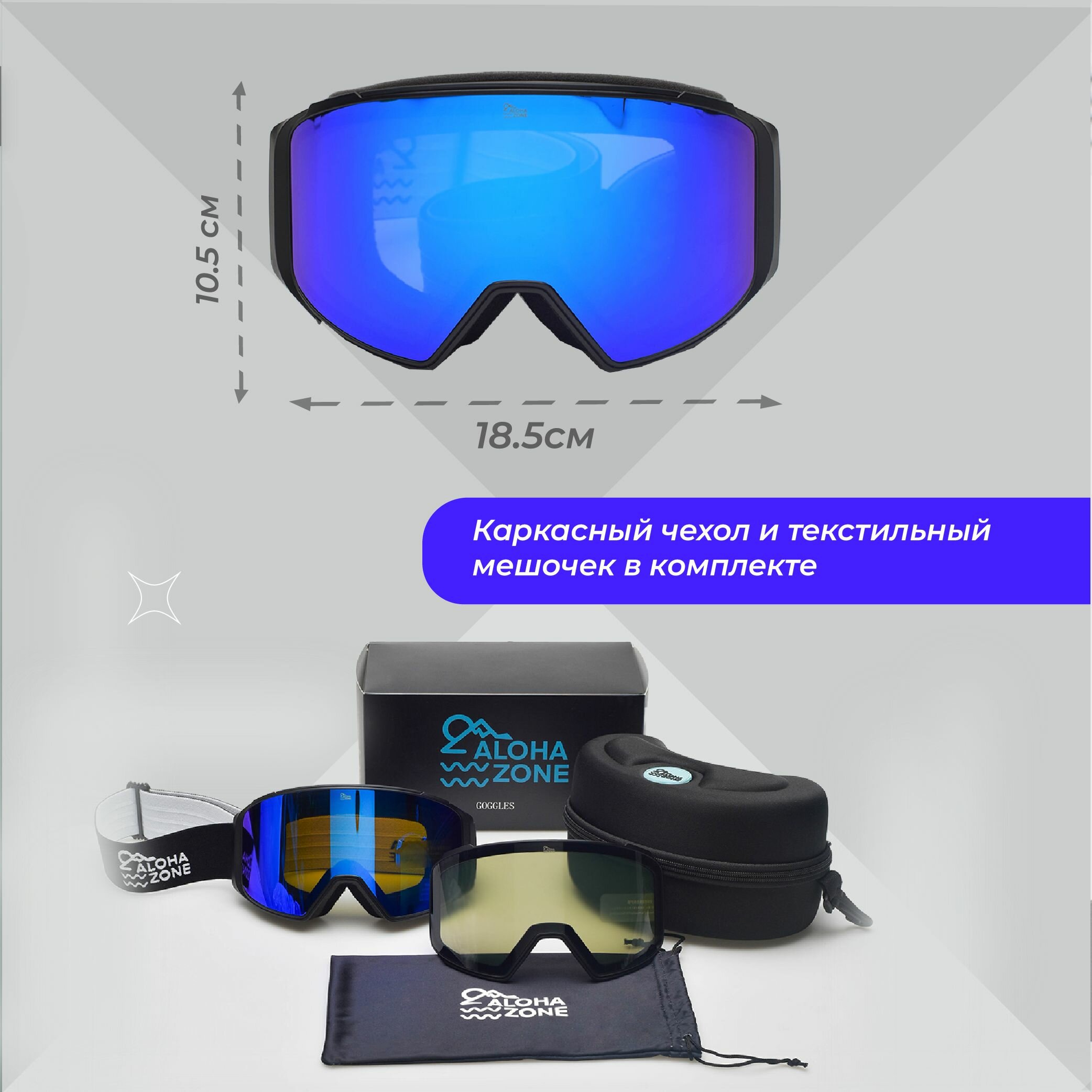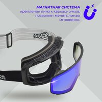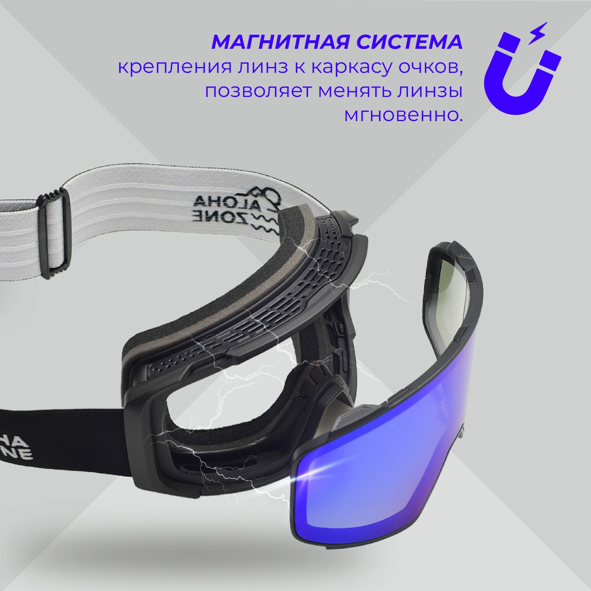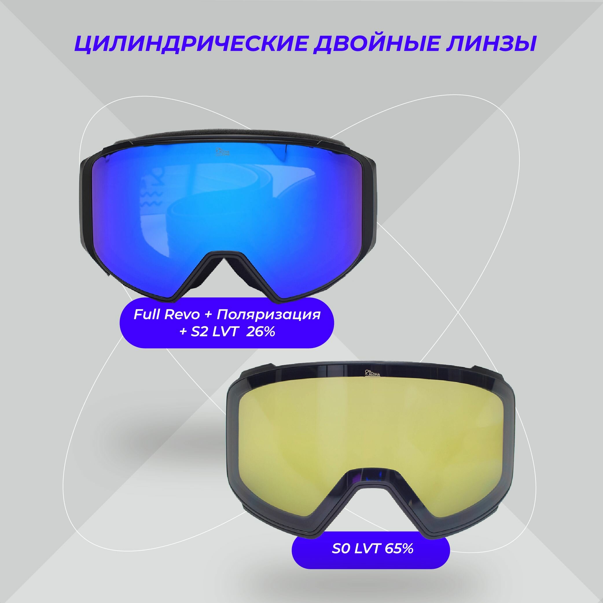 Горнолыжная маска сноубордическая строгой формы, две двойные сменные линзы в комплекте с защитным боксом и чехлом. Основная линза (Full Revo + Полирезация + S2 LVT 21%), вторая линза для вечернего катания ( S0 LVT 67-73%) Дизайн спортивных очков, широкий обзор, а кроме того, идеальная посадка и идеальная совместимость со шлемами. Маски для сноуборда и горных лыж. 2 двойные линзы на магнитах в комплекте: для ясной , пасмурной погоды и искусственного освещения. Технологии Full Revo и Polarization, антибликовое покрытие, устойчивое к царапинам. Двойной поролоновый слой и слой из мягкой ткани в местах прилегания к лицу. Удобная регулировка размера. Вентиляционные отверстия в маске также препятствуют запотеванию дополняя функционал Anti-Fog . Широкий стреп 4,5 см с противоскользящими силиконовыми вставками