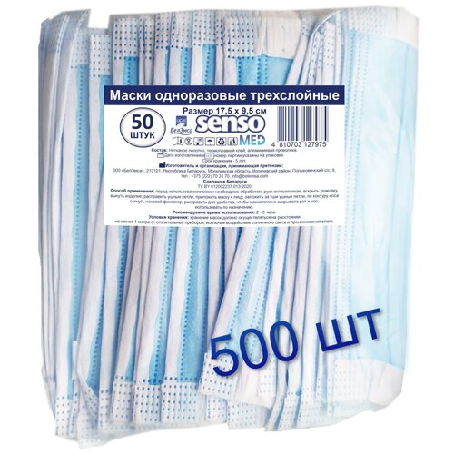 Маска медицинская, одноразовая, из нетканых материалов "Senso MED", цвет: голубой, 500 шт, трехслойная.