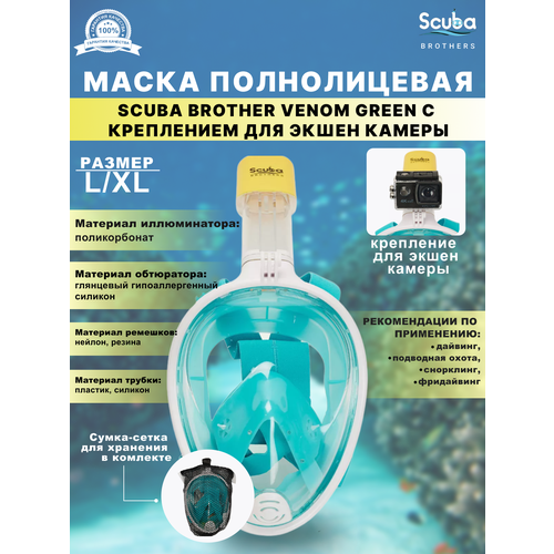 Маска полнолицевая SCUBA BROTHERS VENOM, это полнолицевая маска с двумя клапанами, спроектированная специально для любителей пляжного отдыха и снорлинга. Маска SCUBA BROTHERS VENOM обеспечивает отличный панорамный обзор. За счет сферической формы и большого объема маска обеспечивает широкий обзор до 180 градусов. Линза иллюминатора изготовлена из поликарбоната, который считается одним их самых крепких и безопасных материалов.