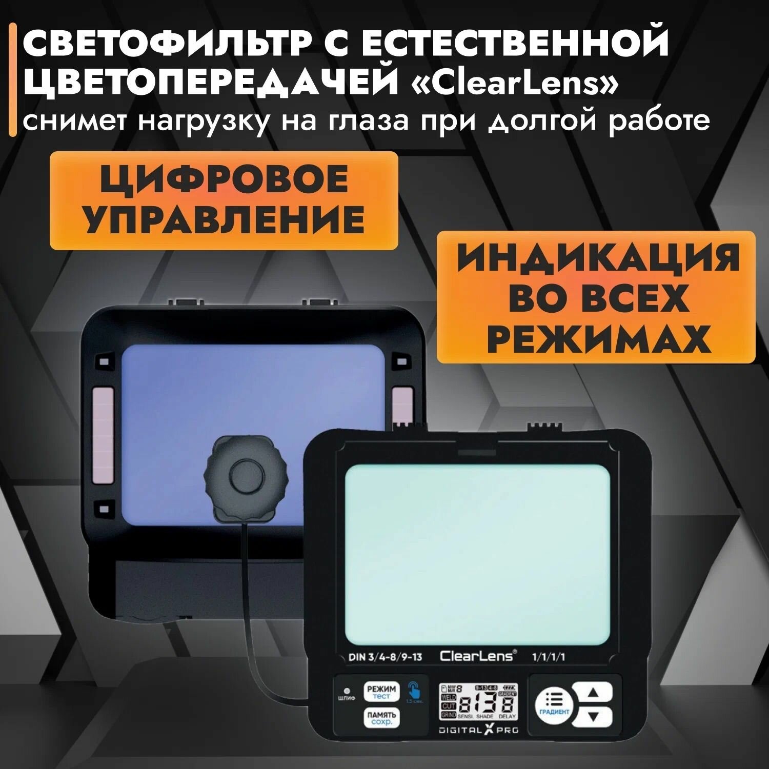 Модель START DIGITAL X PRO оснащена режимом самодиагностики ACF и функцией памяти, что гарантирует точность и надежность работы маски. Кроме того, она оснащена технологией ЖК-ClearLens, которая обеспечивает четкое и яркое изображение во время сварки.