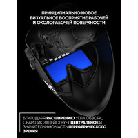 Благодаря расположению глаз непосредственно перед смотровым окном светофильтра угол обзора расширяется, а обозреваемая площадь увеличивается и по горизонтали и по вертикали. Сварщик задействует центральное и значительную часть периферического зрения, что создает принципиально новое визуальное восприятие рабочей и около рабочей поверхности.