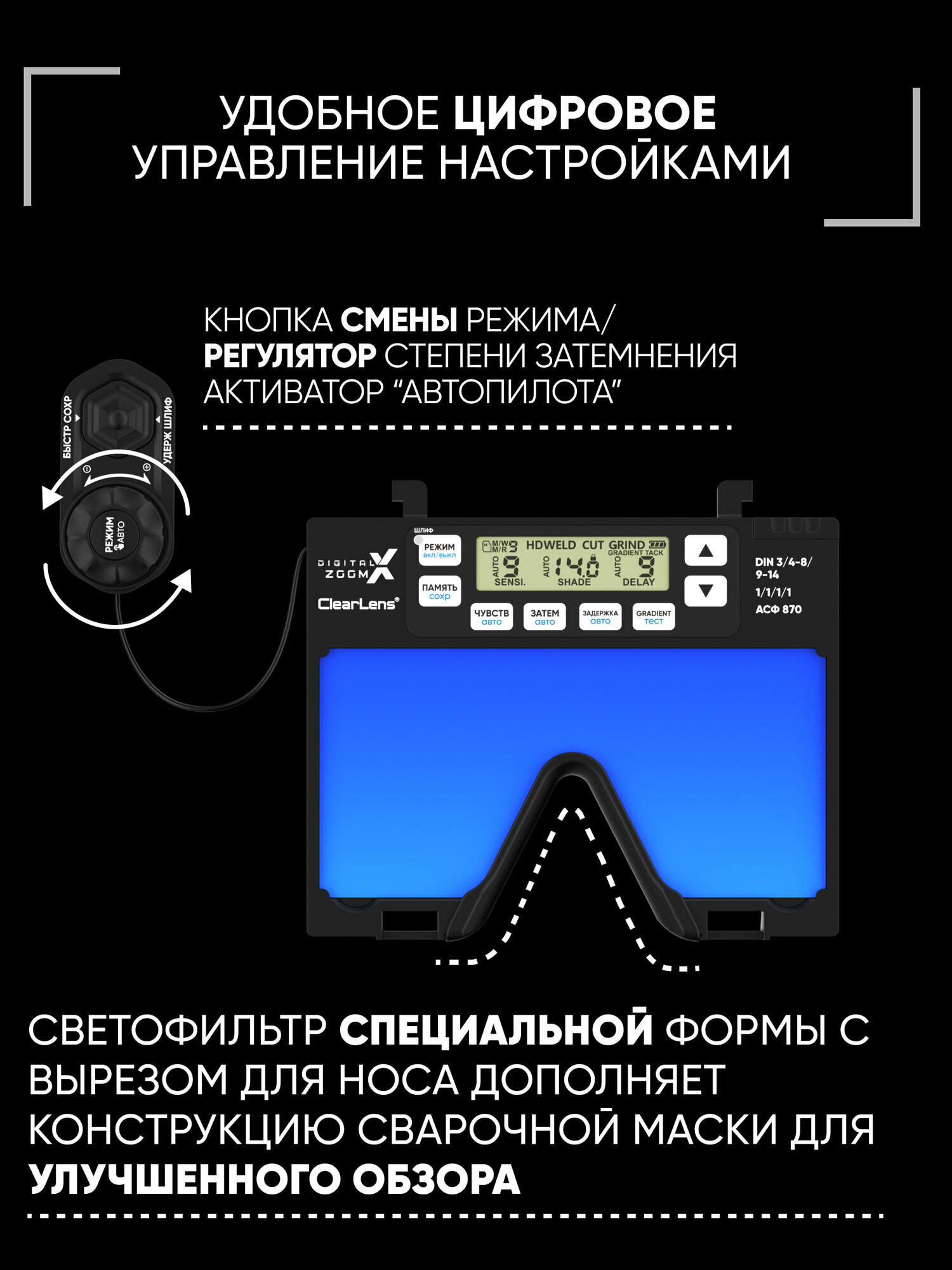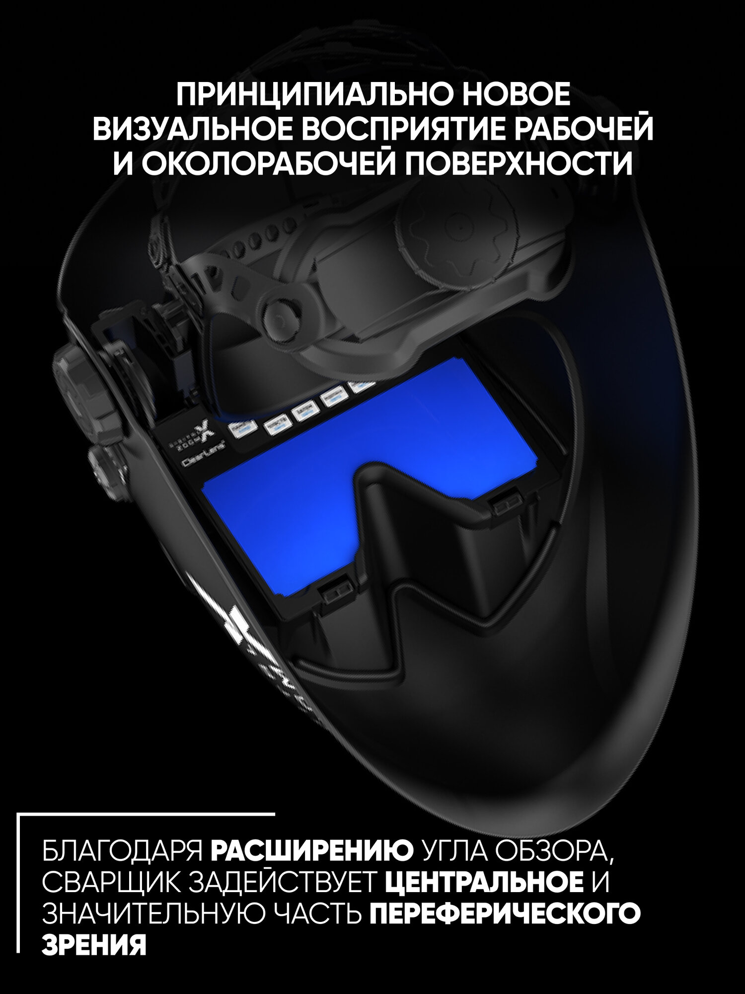 START DIGITAL X ZOOM — маска нового поколения с продуманной конструкцией: выступ на щитке повторяет геометрию лица, что позволяет максимально приблизить светофильтр к глазам сварщика. Такое решение расширяет угол обзора, включая в работу не только центральное, но и периферийное зрение. Это обеспечивает принципиально иное визуальное восприятие рабочей и прилегающей зоны — вы видите больше и работаете точнее.
