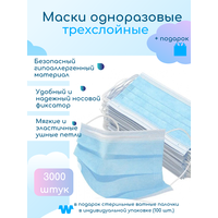 Маски одноразовые, трёхслойные, универсальные, нетканый материал, 3000 шт, цвет голубой: сравнение цен, характеристики, фото, актуальное наличие и цены.