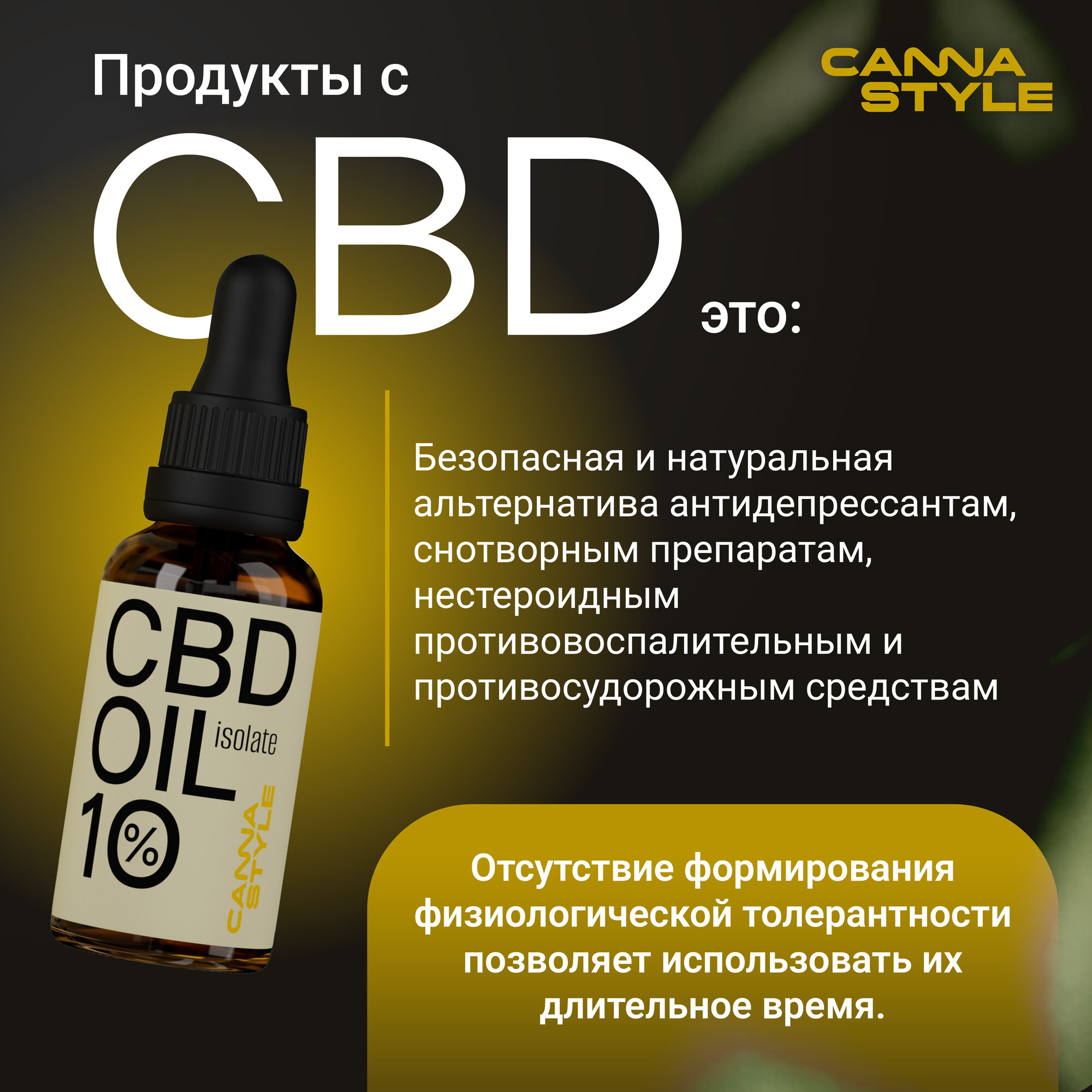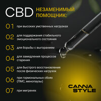 CannaStyle - бренд CBD продукции, активно занимающийся разработкой уникальной продуктовой линейки для российского рынка, которая включает масла CBD с новыми вкусами и формами приема, вейп жидкости с CBD и одноразовые электронные испарители с CBD, функциональные напитки и пищевые продукты с CBD. В основе продуктов используется сырье от ведущих производителей Америки, соответствующее высоким международным стандартам GMP. CBD масло CannaStyle Natural — это комплексная пищевая добавка премиум класса, имеющая натуральный вкус масла MCT. CBD OIL получило признание научного сообщества и обрело популярность у людей, заботящихся о своем здоровье по всему миру. Масло CBD (КБД) обладает широким спектром воздействия и может помочь: нормализовать сон, снизить уровень тревоги и стресса, способствовать снижению веса, помочь бросить курить, облегчить болевой синдром, а также является дополнительным источником витаминов. Поддерживает внутренний баланс организма, стимулирует иммунную систему, обладает противовоспалительными и антиоксидантными свойствами. 100% натуральный состав. Сырьё для нашей продукции производится по международным стандартам GMP ведущими производителями Америки. Экстракция CBD производится с применением экологичного метода CO2 без использования растворителей. В качестве основы используется диетическое масло MCT — эффективный источник полезных для организма жиров, который практически не откладывается в жировой ткани, зато является источником чистой энергии, оно гораздо эффективнее других жиров, что способствуют более быстрому и эффективному усваиванию CBD. Каждая партия проверяется в независимой лаборатории, вы можете быть уверены, что в нашей продукции не содержится ТГК. Противопоказания: индивидуальная непереносимость, период беременности и лактации. Если Вы планируете принимать масло КБД с какими-либо другими лекарствами, то перед началом приема необходимо проконсультироваться с вашим лечащим врачом Не является лекарственным средством!