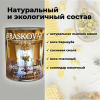 Масло Kraskovar Deco Oil Interior за счет натуральных высококачественных компонентов, пчелиного воска, воска карнауба, не образует пленку и позволяет древесине дышать, защищает от влаги , прения и растрескивания , подчеркивает рисунок дерева, безопасен для людей и животных. Подходит для деревянных поверхностей различного типа: игрушек, мебели, стен, полов, потолков и других изделий из дерева. Применимо для финишного покрытия. Данное масло предназначено для работ внутри помещения.