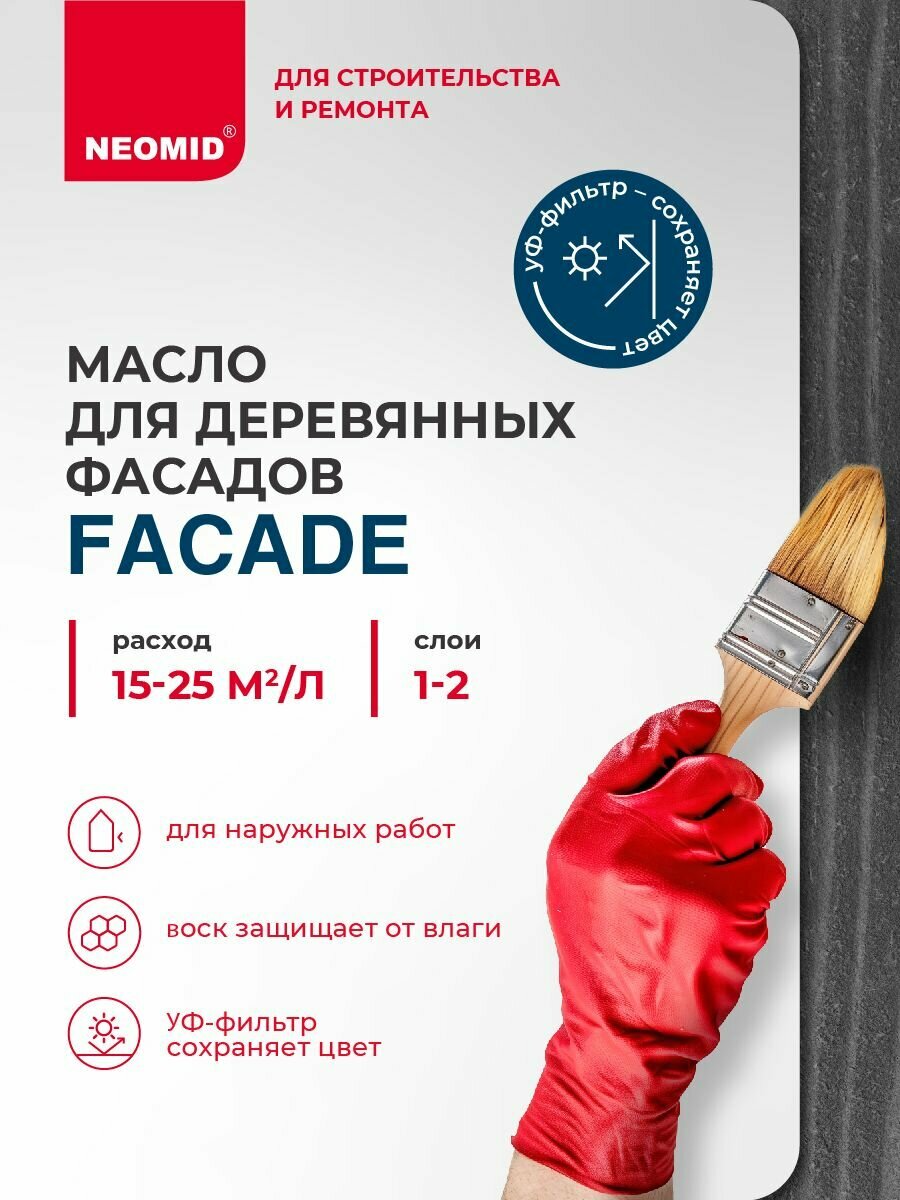 Масло для деревянных фасадов NEOMID PREMIUM FACADE Защищает от плесени Препятствует растрескиванию Легкое обновление УФ- фильтр — сохраняет цвет Для наружных работ Для защиты от влаги, плесени и декоративной обработки деревянных поверхностей снаружи помещения. Объекты нанесения: фасады домов из бруса, бревна, доски, обшивки из вагонки, блокхауса, планкена; бани, беседки, заборы, садовая мебель, окон и дверей. Свойства: Уменьшает растрескивание древесины, подчеркивая естественную красоту дерева Обеспечивает шелковистое, приятное на ощупь покрытие. Воск в составе повышает водо- и грязеотталкиващие свойства поверхности. УФ фильтр защищает цвет древесины от выгорания. Масло быстро высыхает, обладает слабым запахом и устойчиво к воздействию воды и бытовых моющих средств. Не трескается, не отслаивается, не шелушится, так как не образует пленки — благодаря этому обновление не требует шлифовки и снятия предыдущего покрытия.