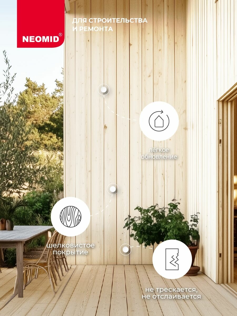 Масло для деревянных фасадов NEOMID PREMIUM FACADE Защищает от плесени Препятствует растрескиванию Легкое обновление УФ- фильтр — сохраняет цвет Для наружных работ Для защиты от влаги, плесени и декоративной обработки деревянных поверхностей снаружи помещения. Объекты нанесения: фасады домов из бруса, бревна, доски, обшивки из вагонки, блокхауса, планкена; бани, беседки, заборы, садовая мебель, окон и дверей. Свойства: Уменьшает растрескивание древесины, подчеркивая естественную красоту дерева Обеспечивает шелковистое, приятное на ощупь покрытие. Воск в составе повышает водо- и грязеотталкиващие свойства поверхности. УФ фильтр защищает цвет древесины от выгорания. Масло быстро высыхает, обладает слабым запахом и устойчиво к воздействию воды и бытовых моющих средств. Не трескается, не отслаивается, не шелушится, так как не образует пленки — благодаря этому обновление не требует шлифовки и снятия предыдущего покрытия.