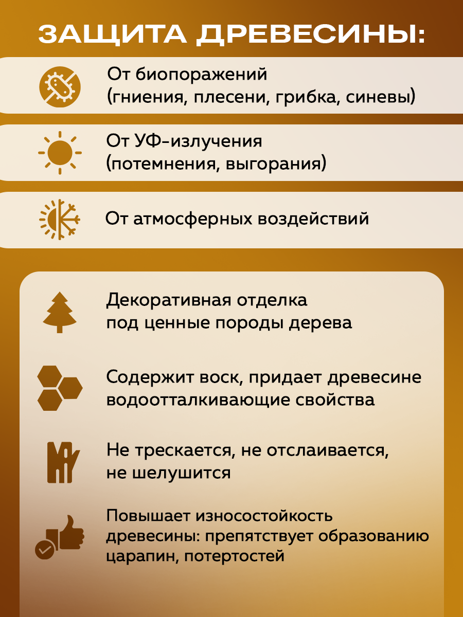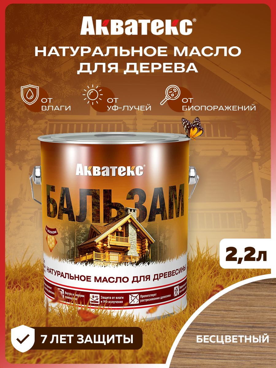 Натуральное масло для защиты древесины от биопоражений (гниения, плесени, грибка, синевы), от УФ-излучения (потемнения, выгорания), от атмосферных воздействий и для декоративной отделки под ценные породы дерева. Назначение: Защита древесины: от биопоражений (гниения, плесени, грибка, синевы); от УФ-излучения (потемнения, выгорания); от атмосферных воздействий. Декоративная отделка под ценные породы дерева. Область применения: Применяется внутри и снаружи помещений: по новым и старым (неокрашенным или очищенным от старого покрытия) деревянным основаниям, в том числе твердых и экзотических пород и термообработанной древесине; по деревянным основаниям, ранее обработанным составом Акватекс Бальзам или аналогичными составами (маслами); по любым материалам на основе древесины (ДВП, ДСП, MDF, фанера, клееный брус и др.); подходит для обработки деревянных настилов, лестниц, террас, полов. Свойства: исключительная экологичность: содержит только природные масла, сохраняет ощущение натурального дерева; содержит натуральный воск, придает древесине водоотталкивающие свойства; обеспечивает максимальную защиту от выгорания: содержит УФ-фильтры UV-A и UV-B диапазонов, УФ-абсорберы и транспарентные нано-пигменты; защищает от биопоражений: содержит трудновымываемый антисептик (высокоэффективную комбинацию фунгицидов); обладает отличной впитываемостью, глубоко проникает в структуру древесины; повышает износостойкость древесины: препятствует образованию царапин, потертостей и других повреждений на поверхности; образует паропроницаемое («дышащее») покрытие; легко наносится: не образует подтеков, не требует полировки, шлифовки, шкурения между слоями; не трескается, не отслаивается, не шелушится; легко реставрируется (обновляется) только отдельными участками, того требующими.