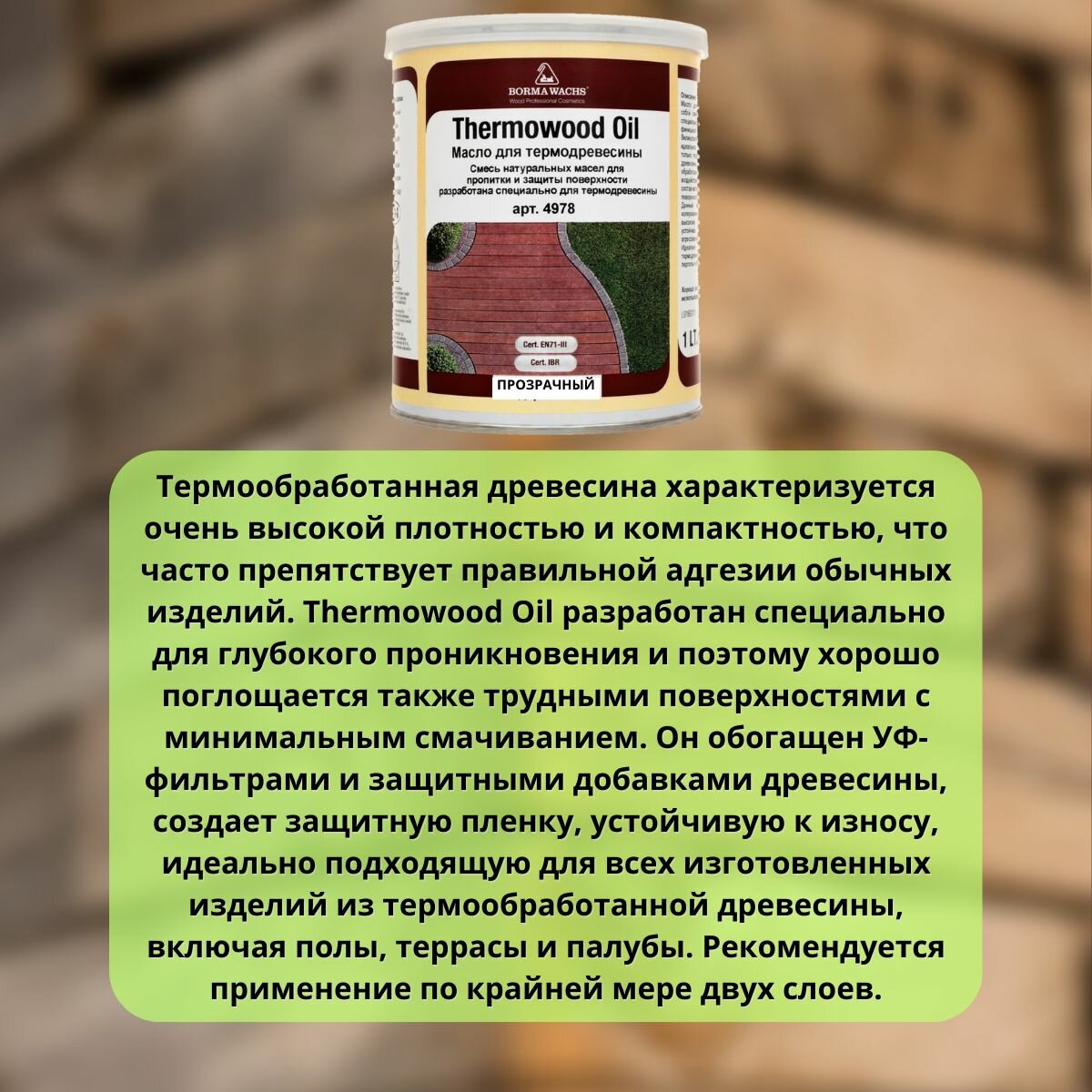 Термообработанная древесина характеризуется очень высокой плотностью и компактностью, что часто препятствует правильной адгезии обычных изделий. Thermowood Oil разработан специально для глубокого проникновения и поэтому хорошо поглощается также трудными поверхностями с минимальным смачиванием. Он обогащен УФ-фильтрами и защитными добавками древесины, создает защитную пленку, устойчивую к износу, идеально подходящую для всех изготовленных изделий из термообработанной древесины, включая полы, террасы и палубы. Рекомендуется применение по крайней мере двух слоев.