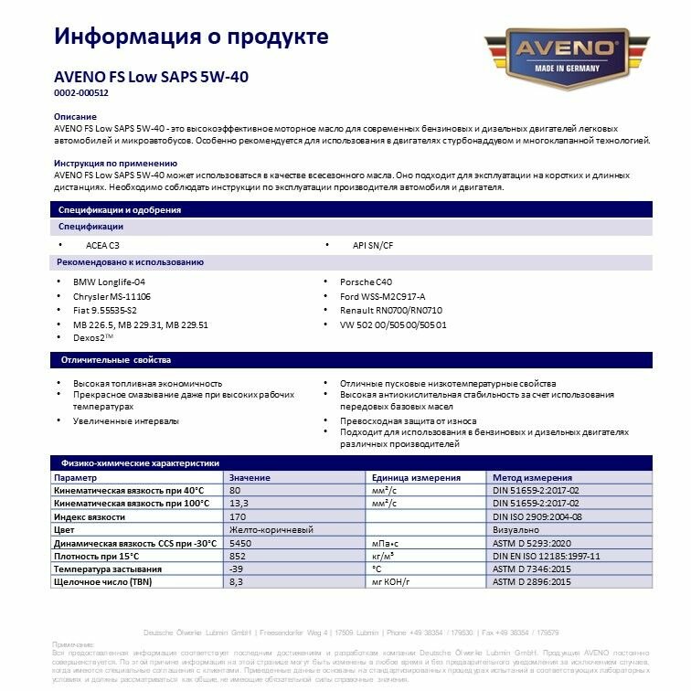 Масло моторное AVENO FS Low SAPS 5W-40 ACEA C3, API SN, BMW Longlife-04, MB 229.51, синтетическое, 4 л: сравнение цен, характеристики, фото, актуальное наличие и цены.