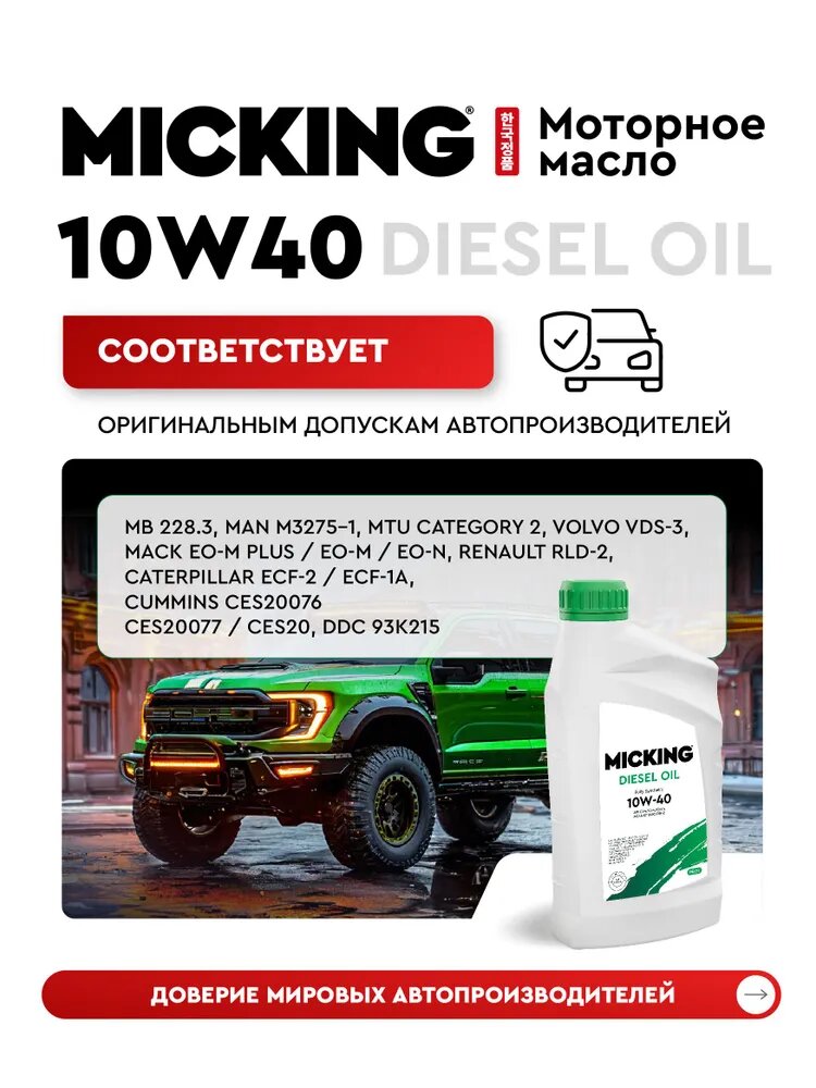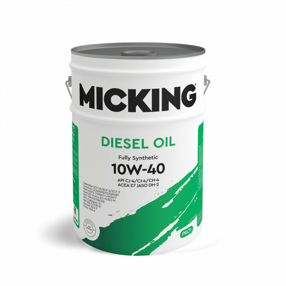 Масло моторное MICKING Diesel Oil PRO1 Fully Synthetic SAE: 10W-40 API: CJ-4/CI-4/CH-4 ACEA: E7 20 L: сравнение цен, характеристики, фото, актуальное наличие и цены.