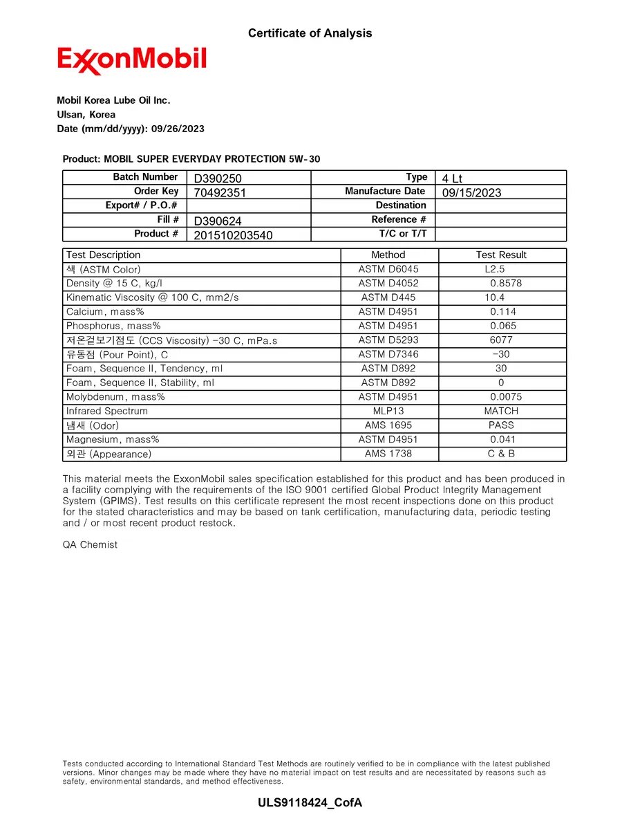 API SN Engine Test Requirements; API SN Plus Engine Test Requirements; API SP Engine Test Requirements; зольность сульфатная: 0,8 % вес., ASTM D874; плотность при 15,6°C: 0,843 г/см3, ASTM D4052; температура вспышки в открытом тигле Кливленда: 235 °C, ASTM D 92; вязкость при высокой температуре и высокой скорости сдвига при 150°C: 2,6 мПа*с, ASTM D4683; кинематическая вязкость при 100°C: 7,8 мм2/с, ASTM D445; температура застывания: -51°C, ASTM D97; индекс вязкости: 175