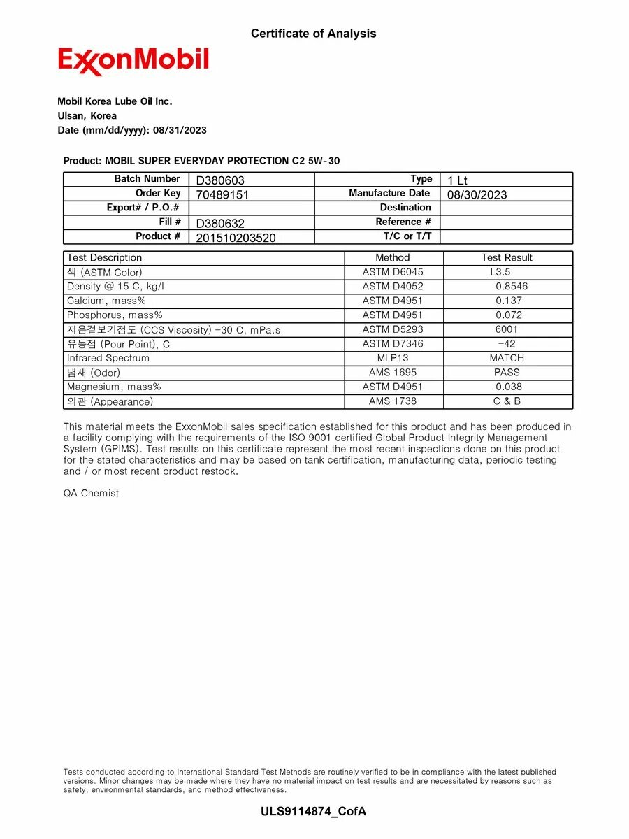 API SN Engine Test Requirements; API SN Plus Engine Test Requirements; API SP Engine Test Requirements; зольность сульфатная: 0,8 % вес., ASTM D874; плотность при 15,6°C: 0,843 г/см3, ASTM D4052; температура вспышки в открытом тигле Кливленда: 235 °C, ASTM D 92; вязкость при высокой температуре и высокой скорости сдвига при 150°C: 2,6 мПа*с, ASTM D4683; кинематическая вязкость при 100°C: 7,8 мм2/с, ASTM D445; температура застывания: -51°C, ASTM D97; индекс вязкости: 175