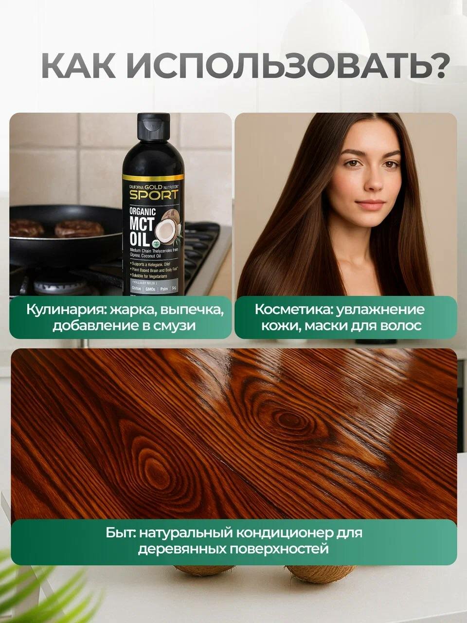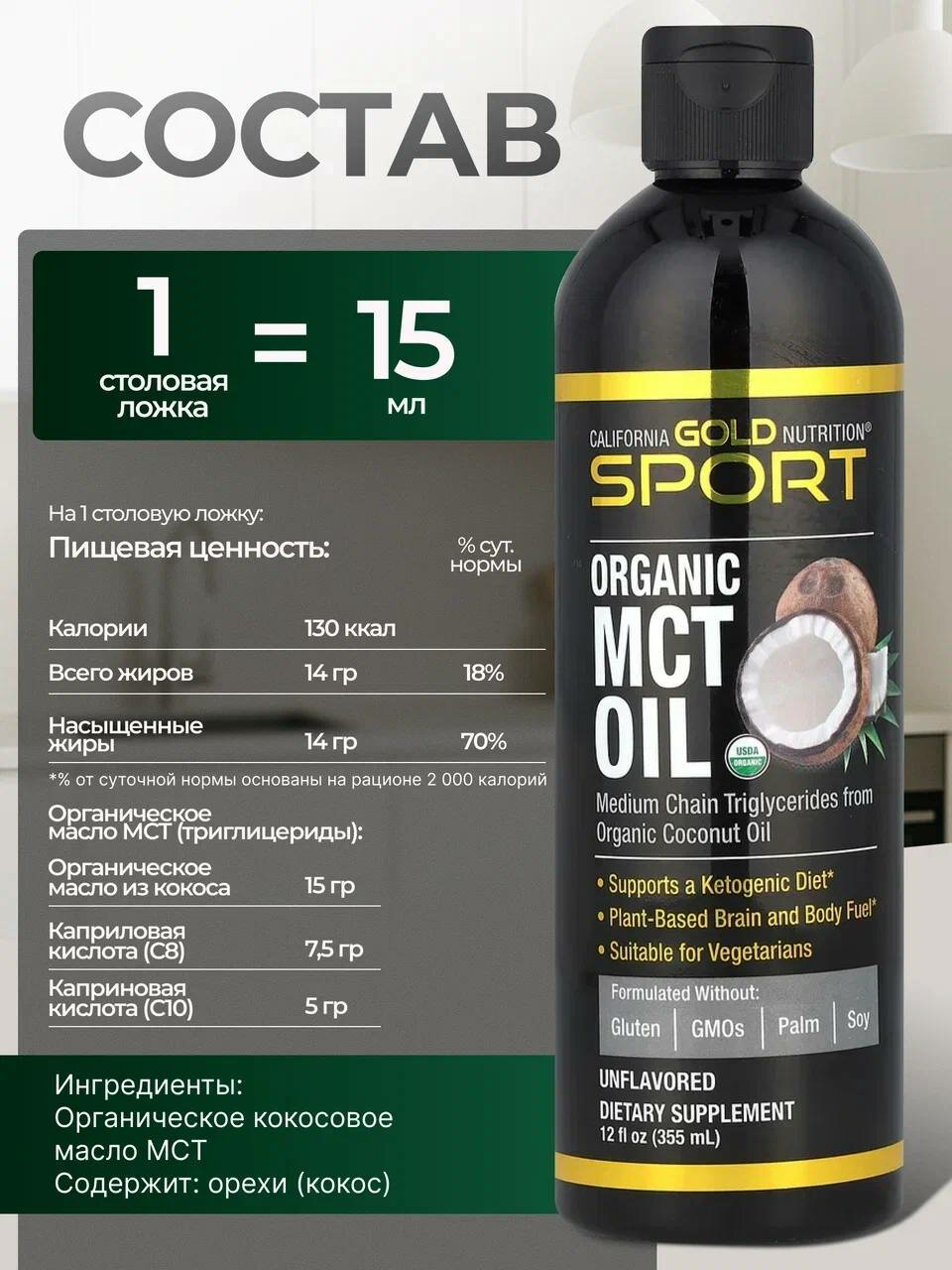 Описание Органическое масло MCT California Gold Nutrition SPORT Среднецепочечные триглицериды из органического кокосового масла, имеющего сертификат USDA Organic Органическое происхождение подтверждено Международным комитетом по гарантии качества (QAI) Подходит для кетогенной диеты* Топливо для мозга и тела на растительной основе* Подходит для веганов и вегетарианцев Не содержит глютена, ГМО, пальмового масла и сои Производится на предприятии, которое имеет регистрацию текущей надлежащей производственной практики (cGMP) и проходит независимые проверки Гарантия 100% Gold Guarantee Среднецепочечные триглицериды или МСТ — это питательные жиры, которые организм может быстро сжечь для выработки энергии. Кокосовое масло является здоровым источником MCT и содержит каприловую и каприновую кислоты, два типа среднецепочечных триглицеридов, которые организм может превратить в кетоны и использовать в качестве топлива. Исследования пользы кетодиеты для здоровья показали ряд ее преимуществ: от снижения веса до улучшения физической выносливости и когнитивных способностей*. Органическое масло MCT California Gold Nutrition SPORT содержит среднецепочечные триглицериды из органического кокосового масла (включая каприловую и каприновую кислоты) и ничего больше: без глютена, ГМО, пальмового масла и сои. Рекомендации по применению Принимать по 1 столовой ложке (15 мл) в день. Рекомендуется принимать в соответствии с назначением квалифицированного медицинского работника. Наше органическое масло MCT можно использовать для приготовления пищи/выпечки, в традиционных рецептах, добавлять в заправки для салатов, коктейли и смузи. Не подходит для жарки. Ингредиенты Основные ингредиенты Органические среднецепочечные триглицериды из органического кокосового масла. Содержит : древесные орехи (кокос). При производстве данного продукта не используются молоко, яйца, рыба, моллюски и ракообразные, арахис, пшеница, соя, кунжут и глютен. Производится на предприятии, которое проходит независимые проверки и, имеет регистрацию текущей надлежащей производственной практики (cGMP), где также могут обрабатываться другие продукты, содержащие эти аллергены или ингредиенты. Произведено на Филиппинах. Каприловая & каприновая кислоты подвержены естественным изменениям. Предупреждения Хранить в недоступном для детей месте. Чрезмерное употребление может вызвать дискомфорт ЖКТ. Перед началом применения пищевых добавок беременные и кормящие женщины, хронические больные, люди преклонного возраста, лица моложе 18 лет, лица, принимающие рецептурные препараты (например, антикоагулянты) или имеющие диагностированное врачом заболевание, должны проконсультироваться с квалифицированным медицинским работником. Продукт герметично упакован в целях безопасности. Не следует использовать продукт, если защитная пленка повреждена или отсутствует. Рекомендуется хранить при контролируемой комнатной температуре 20–25 °C (68–77 °F). Ненадлежащие условия хранения, например, длительное нахождение под прямыми солнечными лучами, высокая температура и влажность, могут со временем привести к ухудшению качества продукта. Отказ от ответственности Компания «EcoHerb» всегда стремится придерживаться максимальной точности в изображениях и информации о своей продукции. Однако некоторые изменения, вносимые производителями, касаю