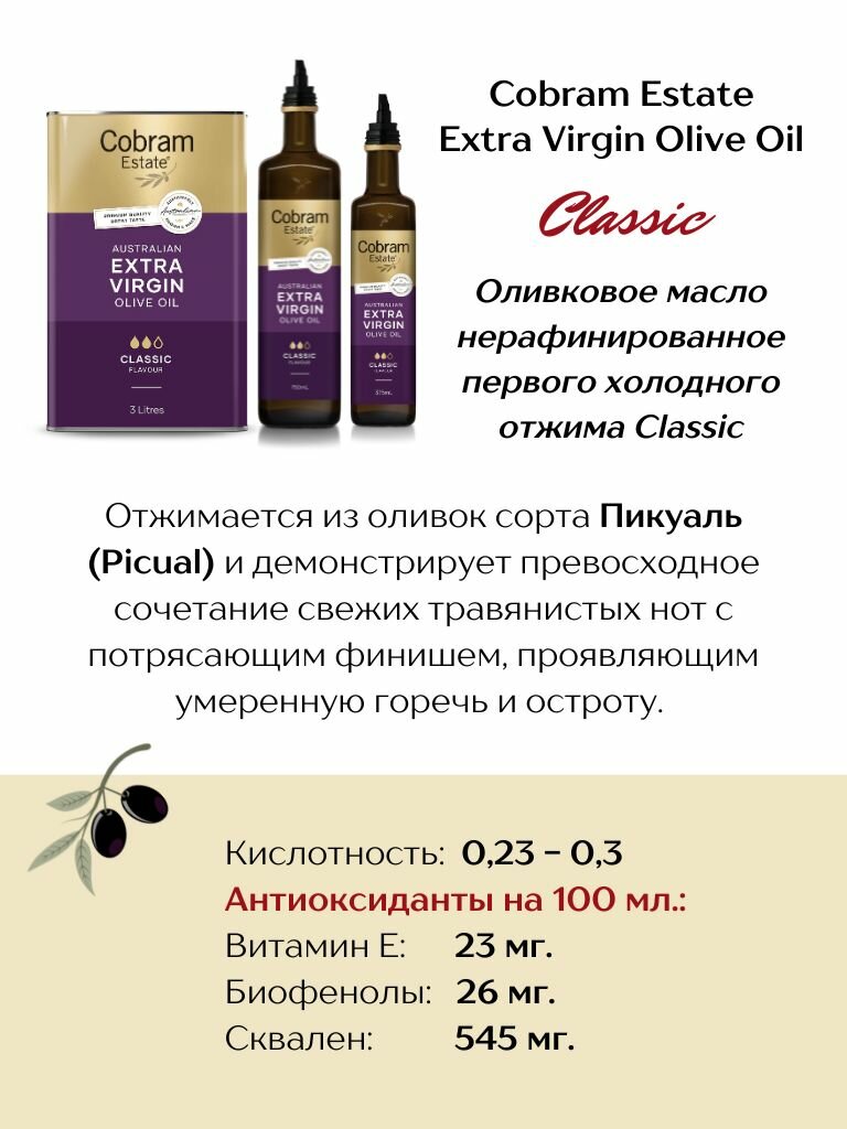 Для производства классического аромата масла Cobram Estate Extra Virgin Classic используются оливки сорта Picual родом из Испании.