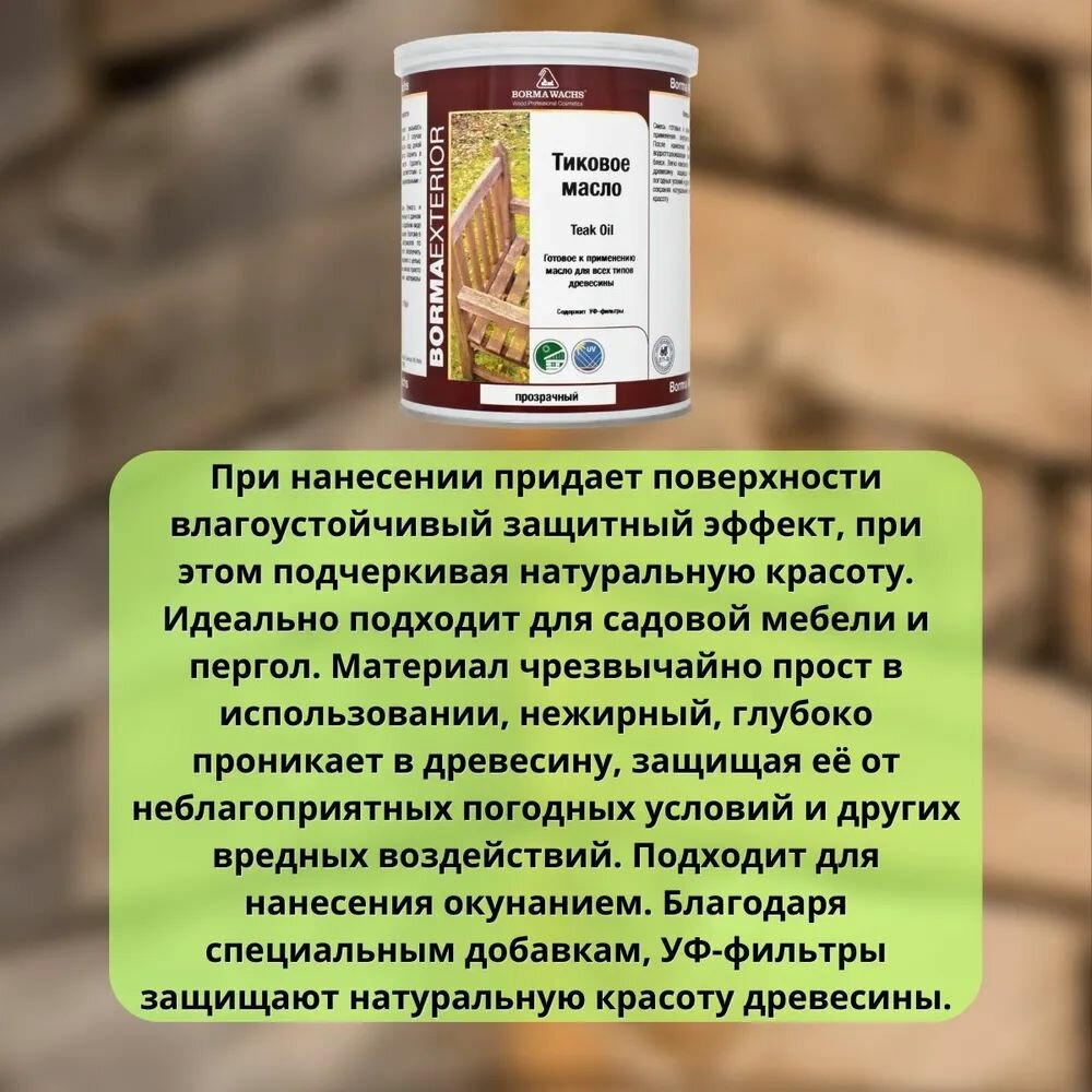 Масло тиковое Borma Teak Oil 1л EN0361: сравнение цен, характеристики, фото, актуальное наличие и цены.