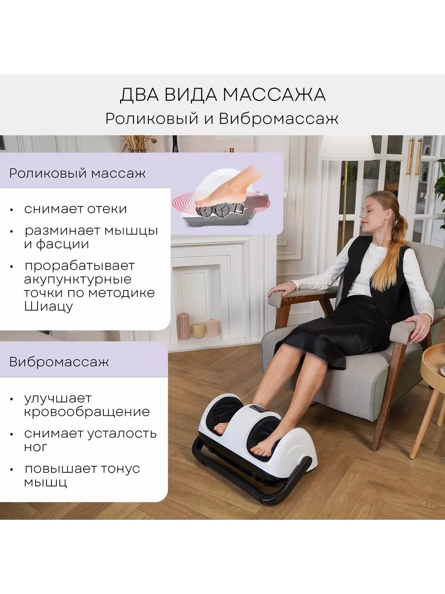 Массажер для тела сочетает несколько методик массажа: роликовый массаж (способствует снижению напряжения в мышцах и суставах, устранению застойных явлений в ногах), массаж шиацу (устраняет дискомфорт в мышцах, оказывает общее расслабляющее действие, улучшает самочувствие, снимает стресс), вибромассаж (устраняет застойные явления) и подогрев (усиливает действие от всех видов массажа, снимает напряжение за счет глубокого прогрева мышц).