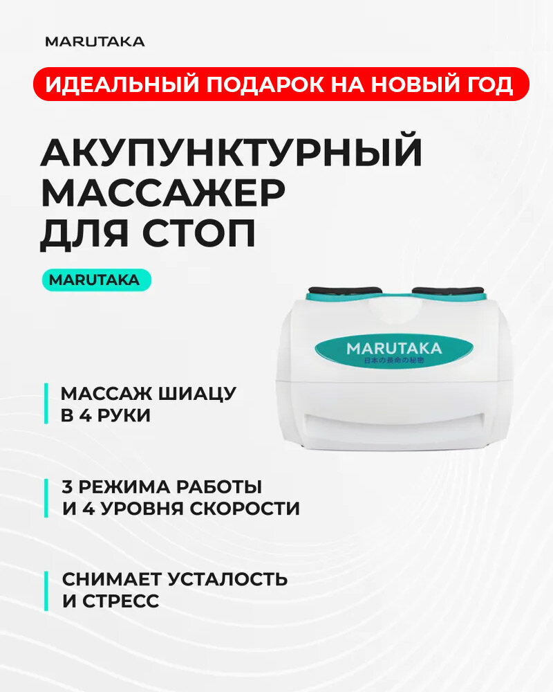 Массажер для ног марутака - единственный массажёр, так искусно имитирующий точечный массаж стоп Шиацу. Массажер для ног Marutaka – единственный аппарат полностью создающий ощущение ручного точечного массажа стоп в четыре руки. В основе действия прибора – авторская методика, разработанная японским медиком Маюри Такада (真百合 高田), проходившим обучение у Токудзиро Намикоси – создателя системы шиацу, признанной Министерством здравоохранения и благосостояния Японии. ассажер для ног Marutaka, разработанный доктором Маюри Такада, тщательно прорабатывает биологически активные точки стоп с помощью интенсивного, но деликатного надавливания. Акупрессурное воздействие на нервные окончания позитивно влияет на нервную, сосудистую и лимфатическую системы организма. Точечный массаж нормализует работу центральной нервной и эндокринной систем и значительно повышает иммунитет. Воздействие на нервные окончания стоп расслабляет, оказывает мощный антидепрессивный эффект, снимает напряжение и чувство усталости, а также помогает наладить циклы сна и нормализовать давление. Кроме того, во время массажа стоп с массажером Marutaka тщательно прорабатываются пальцы ног: аппарат поочередно вытягивает и массирует их, предотвращая деформацию суставов и образование шишек. Массаж стоп шиацу по авторской методике Маюри Такада Повышает общий тонус организма Разбивает солевые шишки Предотвращает появление шпор Снимает усталость и стресс Нормализует сон Показан при плоскостопии Помогает избавиться от синдрома холодных ног Налаживает кровообращение, предупреждая варикозное расширение вен Эффективен в случае вальгусной деформации стоп: искривления формы стопы и образования на пальцах косточек и шишек Стимулирует мозговую активность Стабилизирует артериальное давление Помогает устранить судороги и мышечные спазмы ног Улучшает работу сердечно-сосудистой системы Противопоказания: остеопороз, переломы за последние 2 года, сердечно-сосудистые заболевания, тромбоз, тромбофлебит, сложные формы венозных заболеваний. Перед применением следует проконсультироваться с врачом.