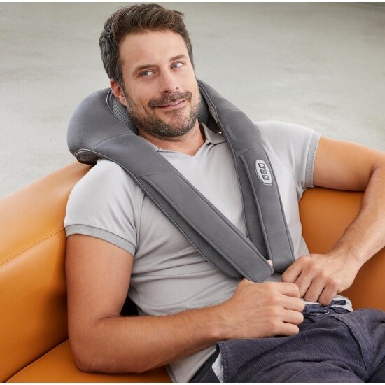 Расслабляющий массаж шиацу для шеи и плеч Возможность работы от батареи или от сети Переключаемая функция нагрева Съемный моющийся чехол для шеи Можно выбрать 3 скорости массажа Чехол из полиэстера, набивка из пеноматериала Интенсивность регулируется индивидуально, потянув за лямки Гибкий - можно использовать на плече, спине, животе, бедрах и голенях Светодиодный индикатор уровня заряда батареи Встроенная панель управления Параметры: 40 × 18,5 × 21 см Вес: 1,6 кг Длина кабеля: около 180 см Электропитание: 220–240 В~ 50/60 Гц, 12,6 В пост. тока
