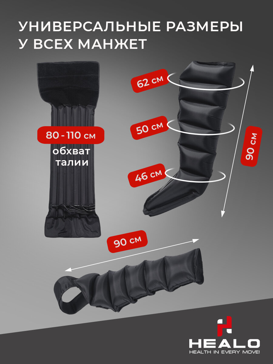 | Дополнительная информация | ЛИмфодреннажный массажер, массажер для рук, ног и тела, аппарат для прессотерапии, 4 режима, 8уровней скорости и интенсивности, 6 камер на каждой манжете, при желании можно отключить столько камер сколько заходите |
