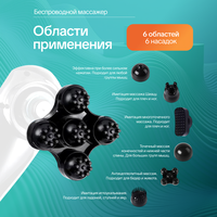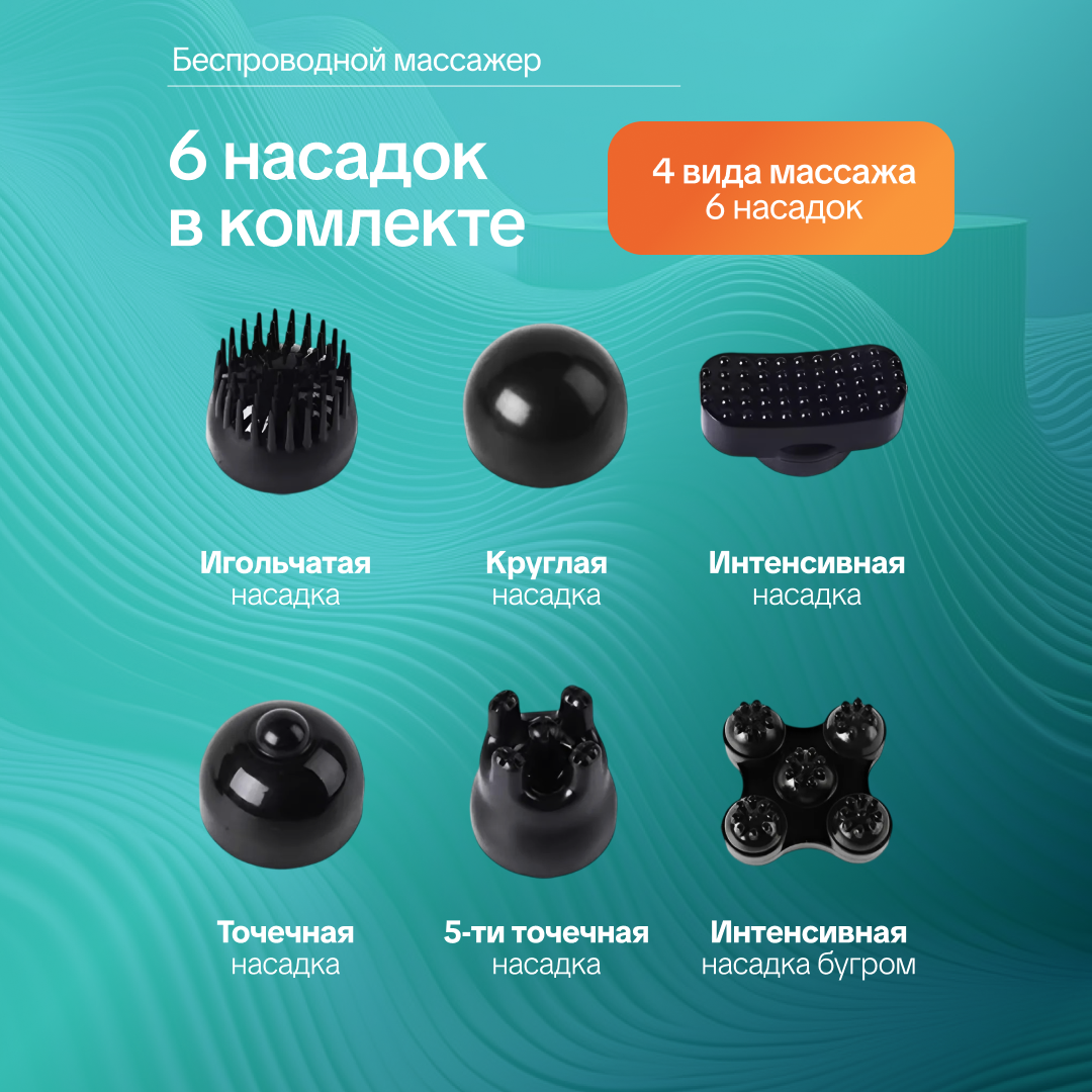 В комплект/набор с массажером входят следующие аксессуары/принадлежности: защитная насадка - сетка (для использования с другими насадками, во избежания попадания волос во вращающие части); волнистая насадка с четырьмя бугорками оптимальна для массажа ног и бёдер; шлифовальная насадка для ног поможет Вам ухаживать за кожей стоп/ступней; плоская насадка для вибромассажа мышц спины, плеч и шеи (для каждодневного массажа плеч, профилактики остеохондроза); насадка с шариками/шариковый антицеллюлитного предназначения. Эргономичная прорезиненная ручка из пластика.