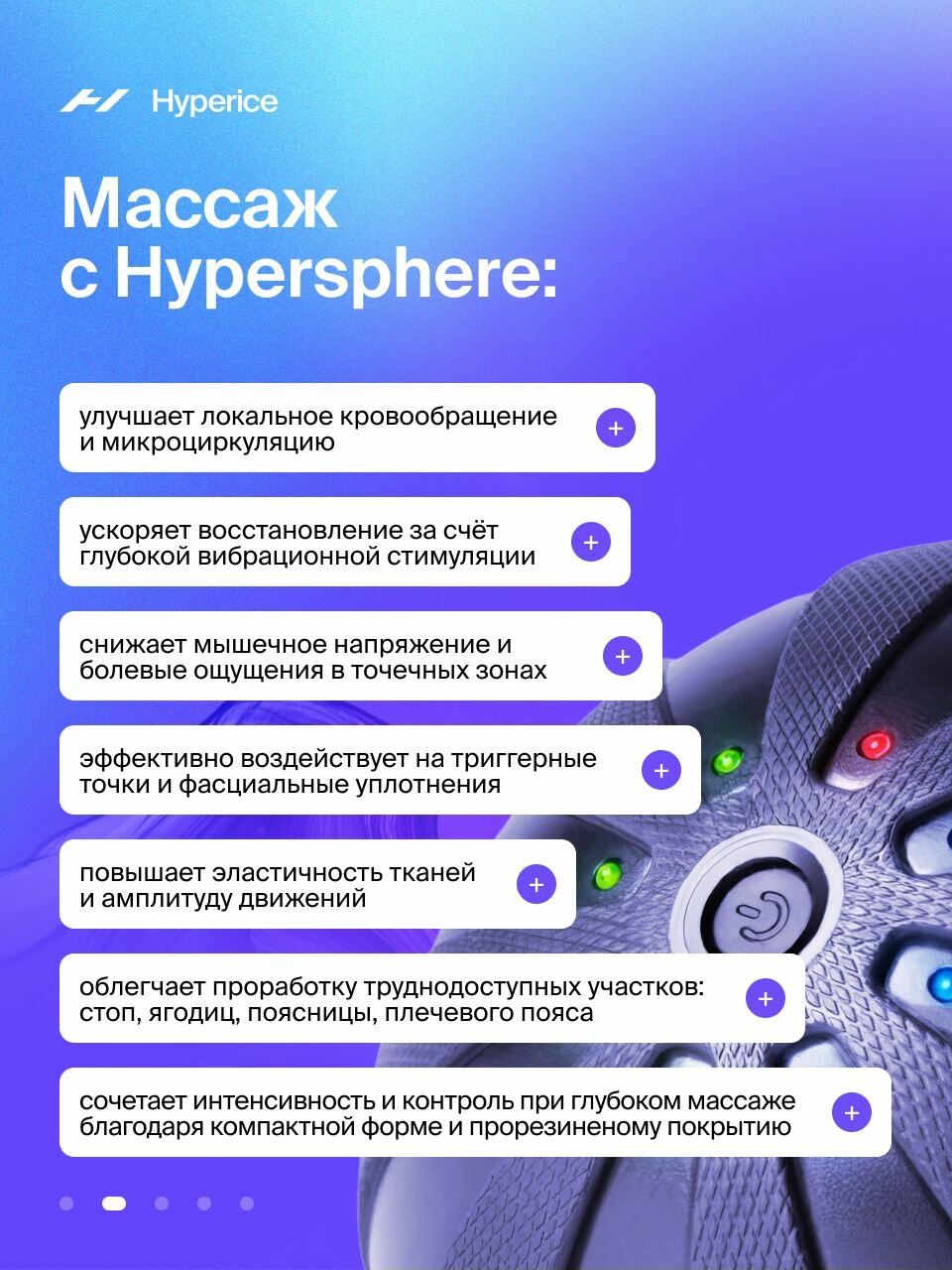 | Дополнительная информация | Рельефная поверхность Hypersphere создана в США при участии передовых спортивных врачей и атлетов. На этапе разработки прототипы тестировали спортсмены и люди с сидячим образом жизни. Так была выведена идеальная текстура и жесткость поверхности, подходящая для максимально глубокого, комфортного тонизирующего массажа.Сферическая форма и ребристая текстура массажера позволяет равномерно прокатывать тело во всех плоскостях с контролируемым давлением — даже в труднодоступных местах. Все, что вам нужно — это Hypersphere, твердая поверхность и готовность испытать удовольствие от глубокого вибромассажа застоявшихся мышц. |